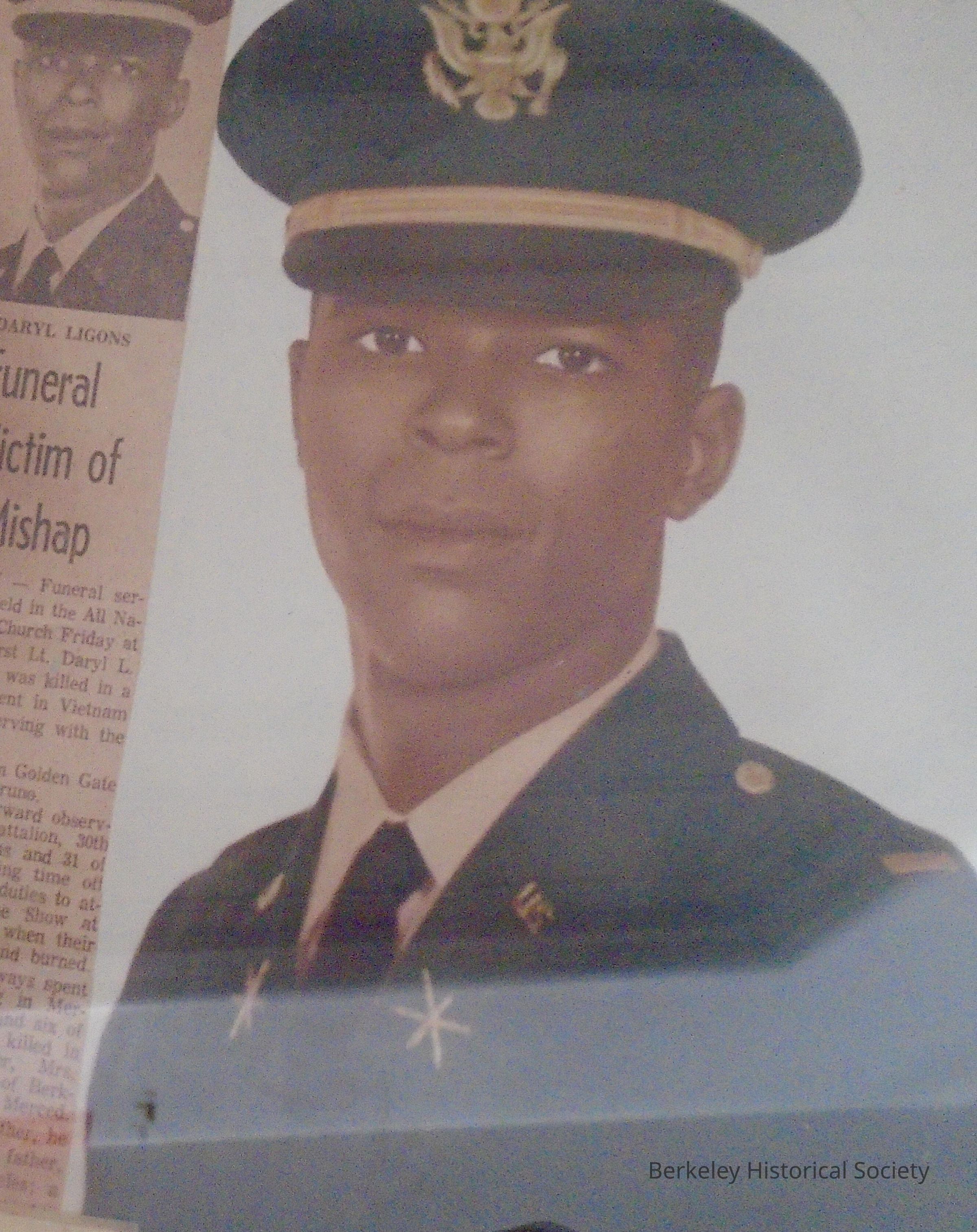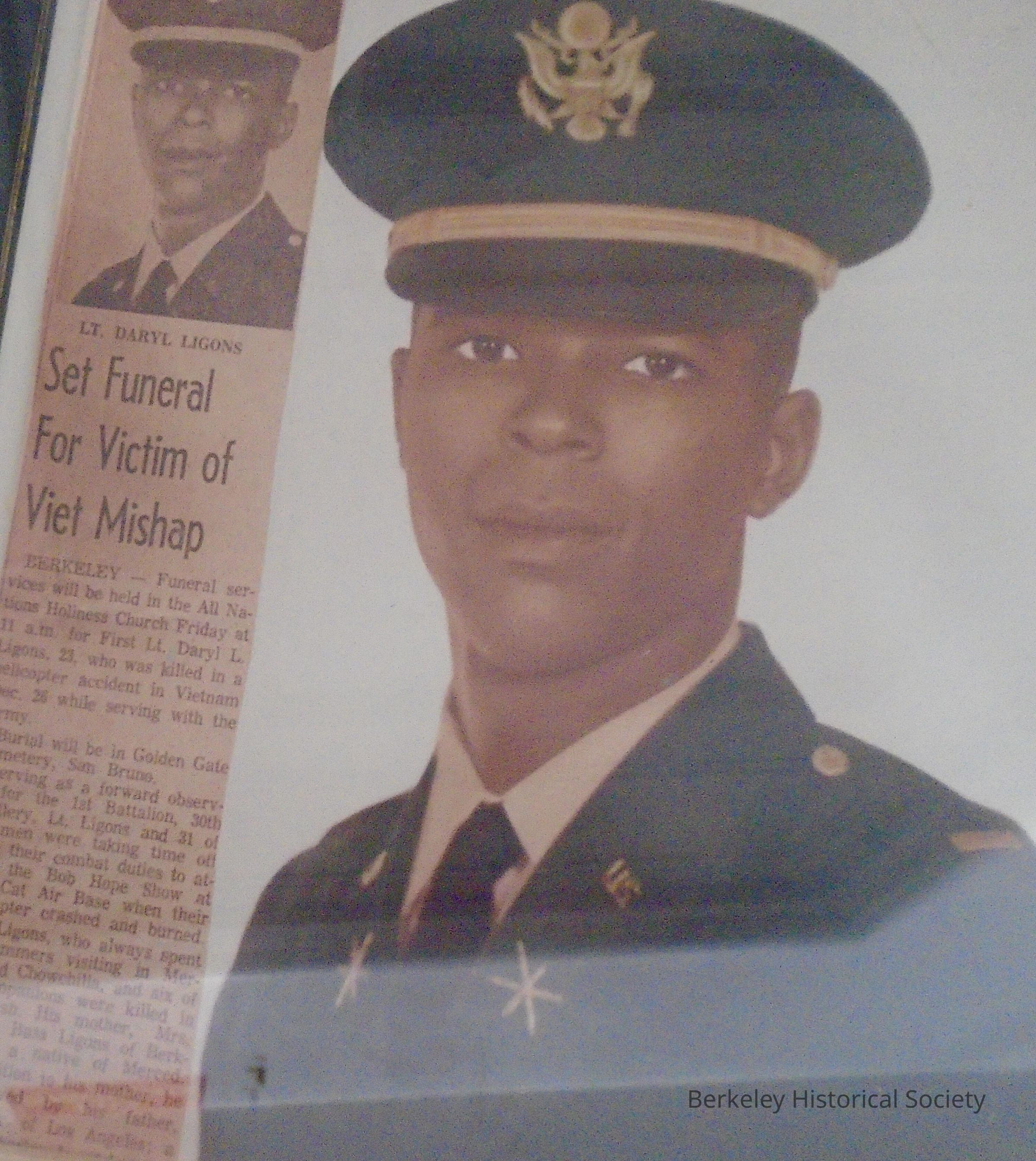 Framed color portrait/photogragh (no glass) of US Army Lt. Daryl Lee Ligons in uniform. Includes newspaper clipping about his funeral. Born 11/11/44 and died 12/26/67 in Vietnam. See also Vietnam Veterans archives box 2015.051.