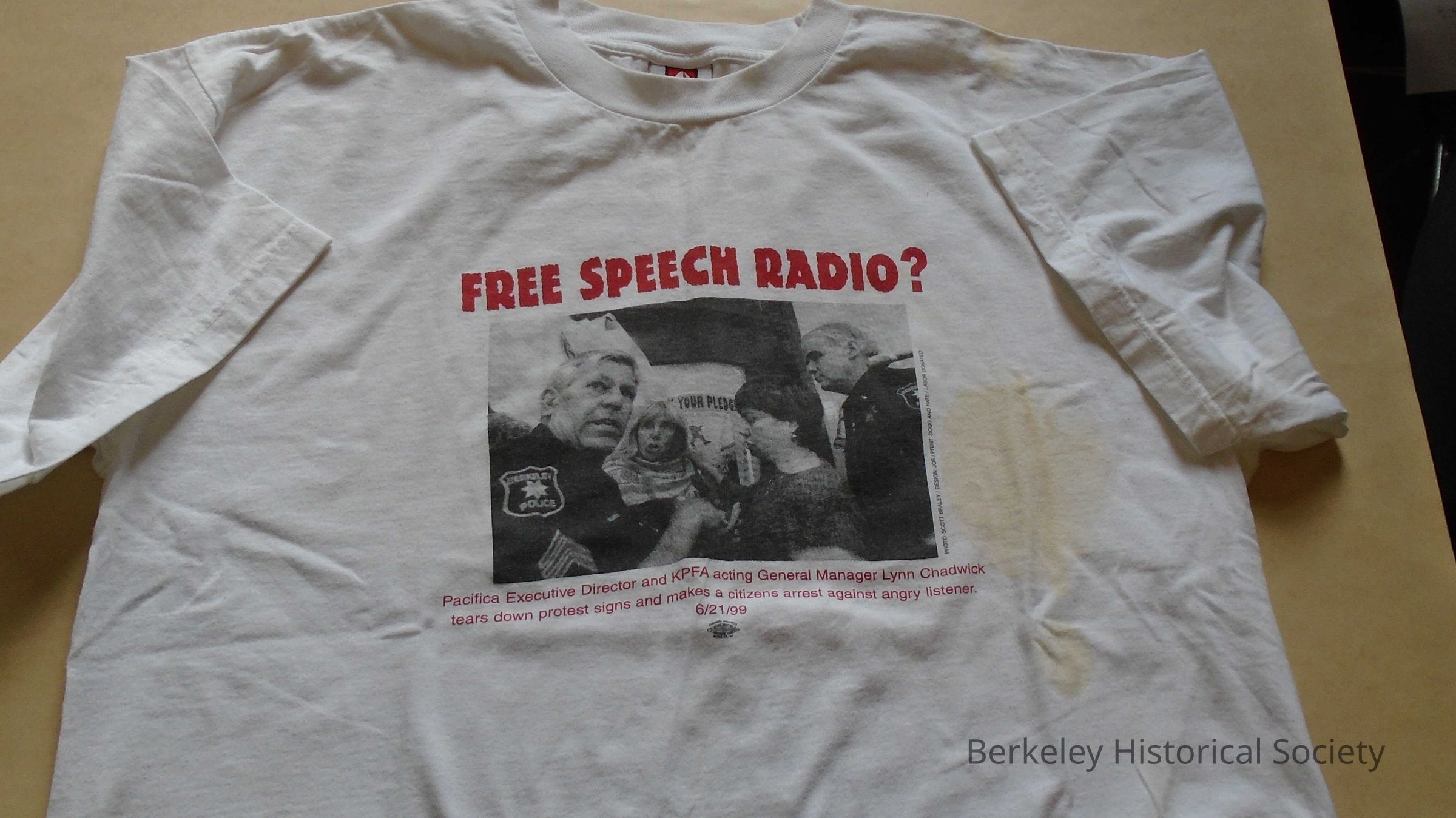 White cotton, short sleeve T-shirt, 2X-large. Text in red on front: "Free speech radio?" Picture of KPFA protest, Pacifica Executive Director and General Manager Lynn Chadwick 6/21/99. Text on back: "Fire Lynn Chadwick Rehire Nicole Sawaya, Larry Bensky, Robbie Osman. Save KPFA."Lexicon