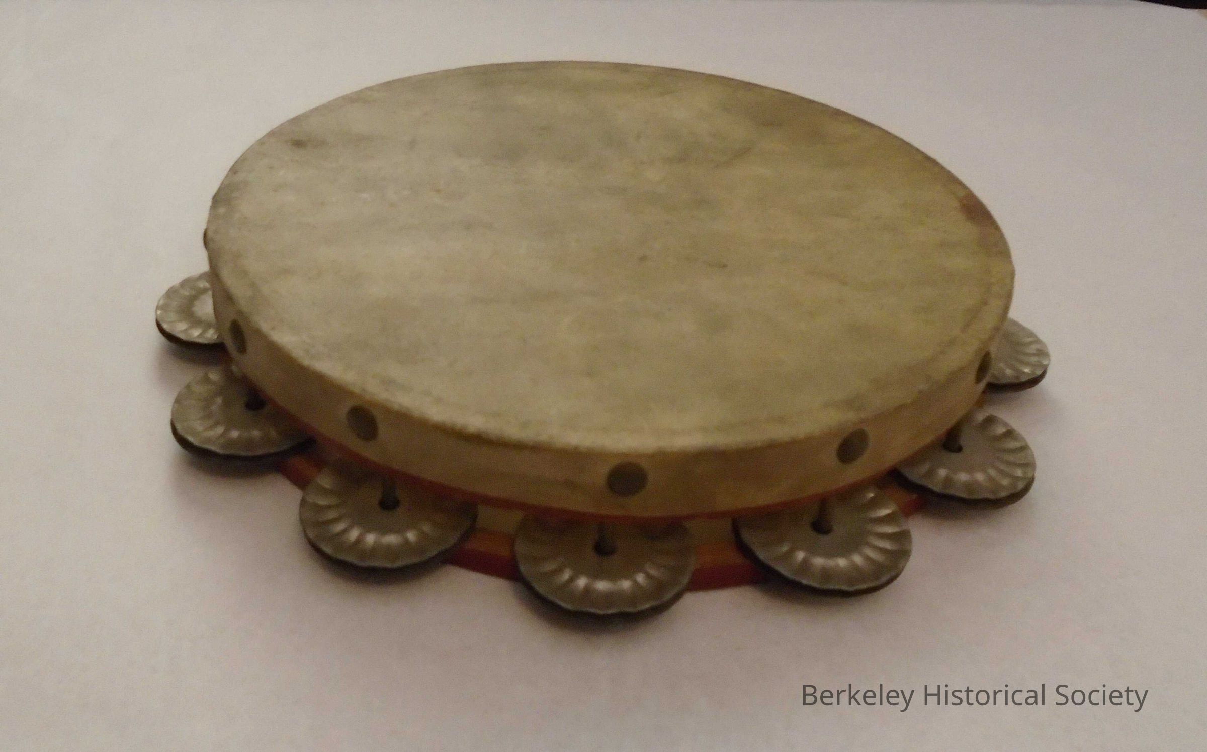 Tamborine is part of a drum kit found at 1791 Capistrano, home of Sigrid Hellen Ilvesta (1917-2013). She was a pianist and part of a band that played at the Finnish Hall. Married to Henry (1918-1982). See also 2014.040.001- .006 and photogragh (in photo collection).