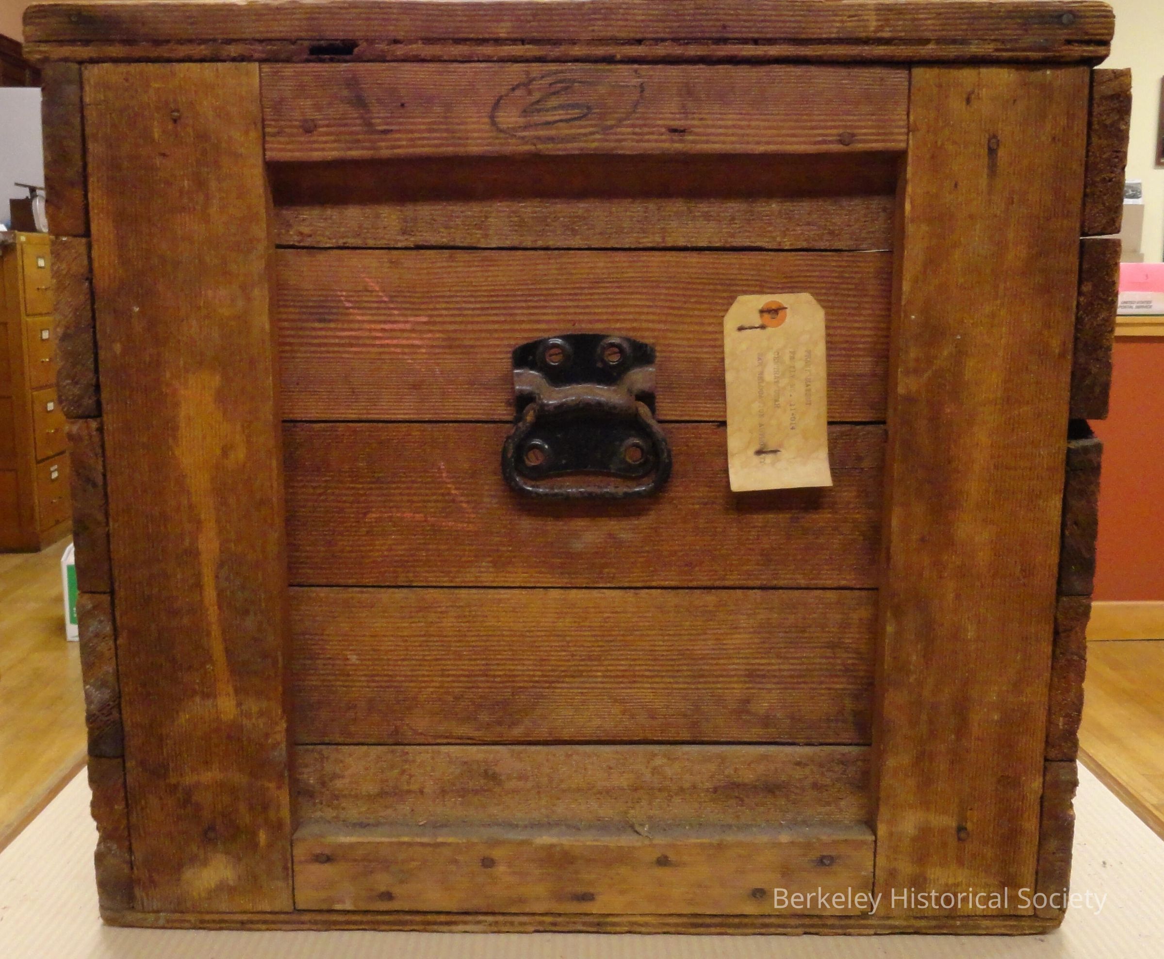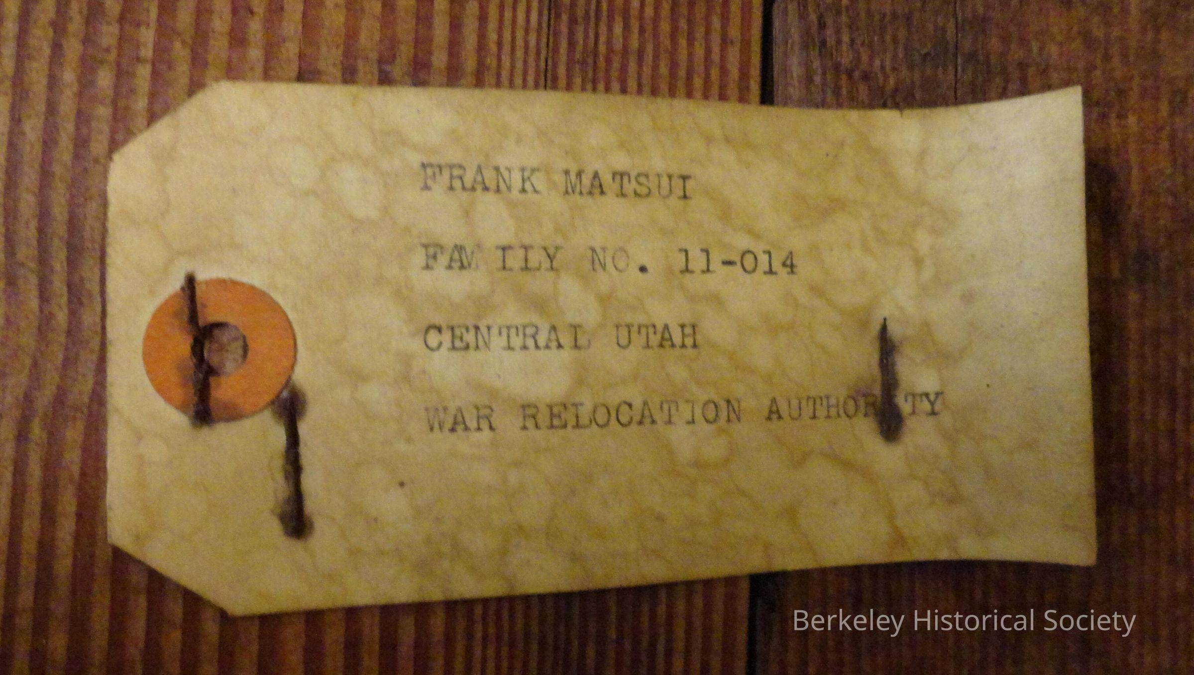 Rectangular, sturdy dark wood trunk. Trunk is nailed together and has metal hinges. Written in black on front: F. T. Matsui, Family 110-14, 1538 Parker St., Berkeley Calif. On back: F.T. Matsui, Central Utah. (Also may have a small piece of paper stapled on one end, typewritten: "Frank Matsui, Family No. 11-014, Central Utah, War Relocation Authority". Can't access to see, but this label was on trunk #1 and they appear to be identical....see 1978.002.333). Used by Frank Matsui and family when they (Japanese) were sent to detention camps during WWII. He originally assembled in Santa Anita (southern Calif.) and was sent to Tule Lake 10/29/42. The family was relocated to Utah/Topaz in 9/28/43. Frank was released in 5/1/44 to work nearby while his family stayed at Topaz. In 1945 they were able to leave and moved to Berkeley.Lexicon