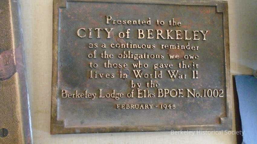 Heavy metal (brass) plaque: "Presented to the City of Berkeley by the Berkeley Lodge of Elks BPOE No. 1002 as a continuous reminder of the obligations we owe to those who gave their lives in World War II February 1948". Originally at the foot of a flagpole at Shattuck Ave., & Center St. and removed when the Berkeley Center Street Bart station was remodeled in 2016.