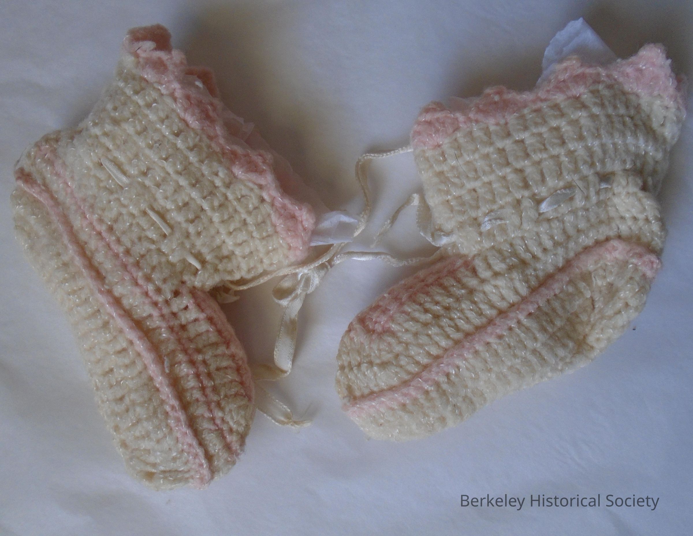 White and pink wool, hand crochet baby bootees. Ribbon tie.