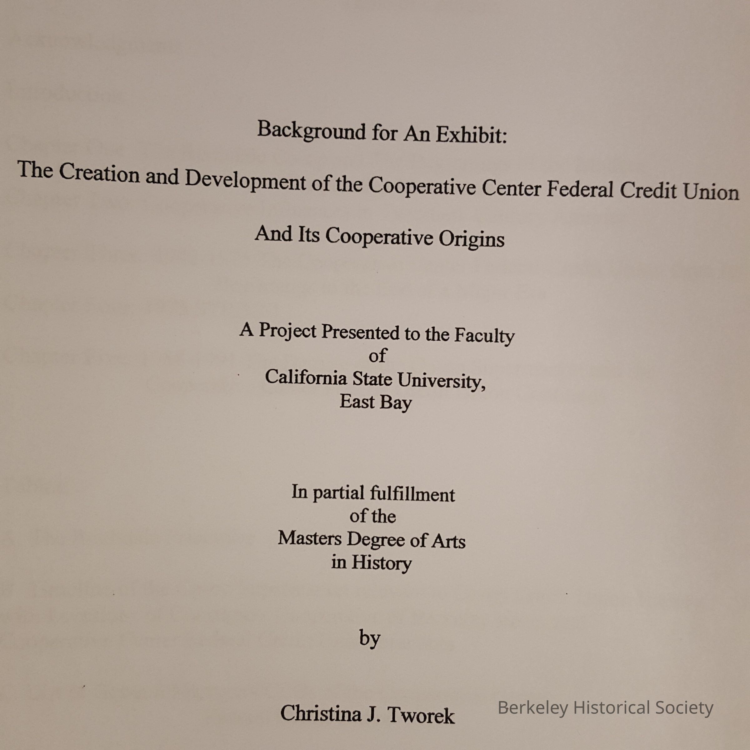 Typescript: masters thesis for degree in arts in history, Cal State University East Bay. 60 leaves + appendices : ill. ; 29 cm. (in binder)