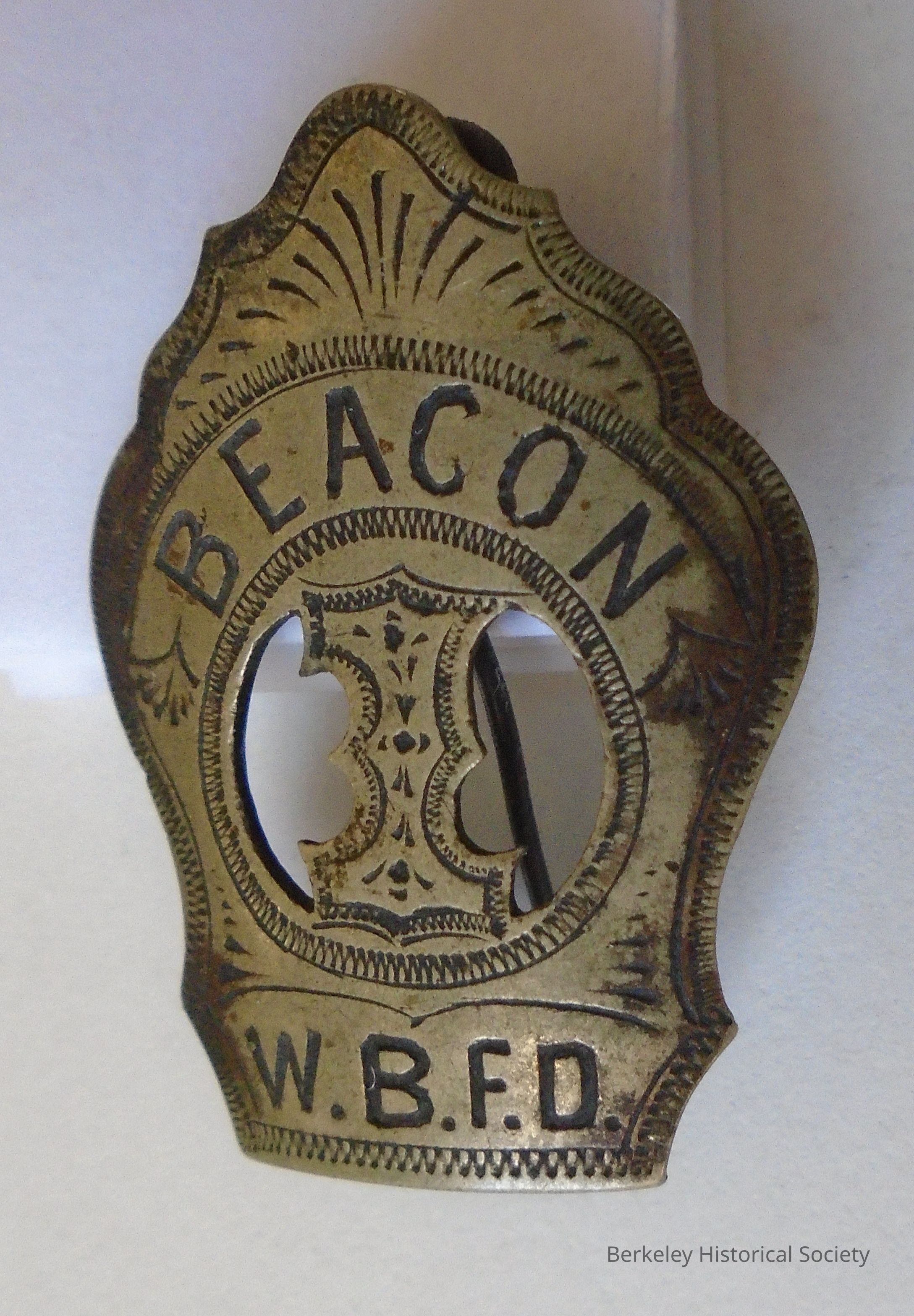 Metal badge (gold/silver color) with BEACON and W.B.F.D. on it. Shaped like an arrowhead with crude pin/clasp on back. Beacon Company was the name of the first Berkeley Volunteer Fire Dept. located at 5th and University. (Volunteer Fire Dept until about 1904)