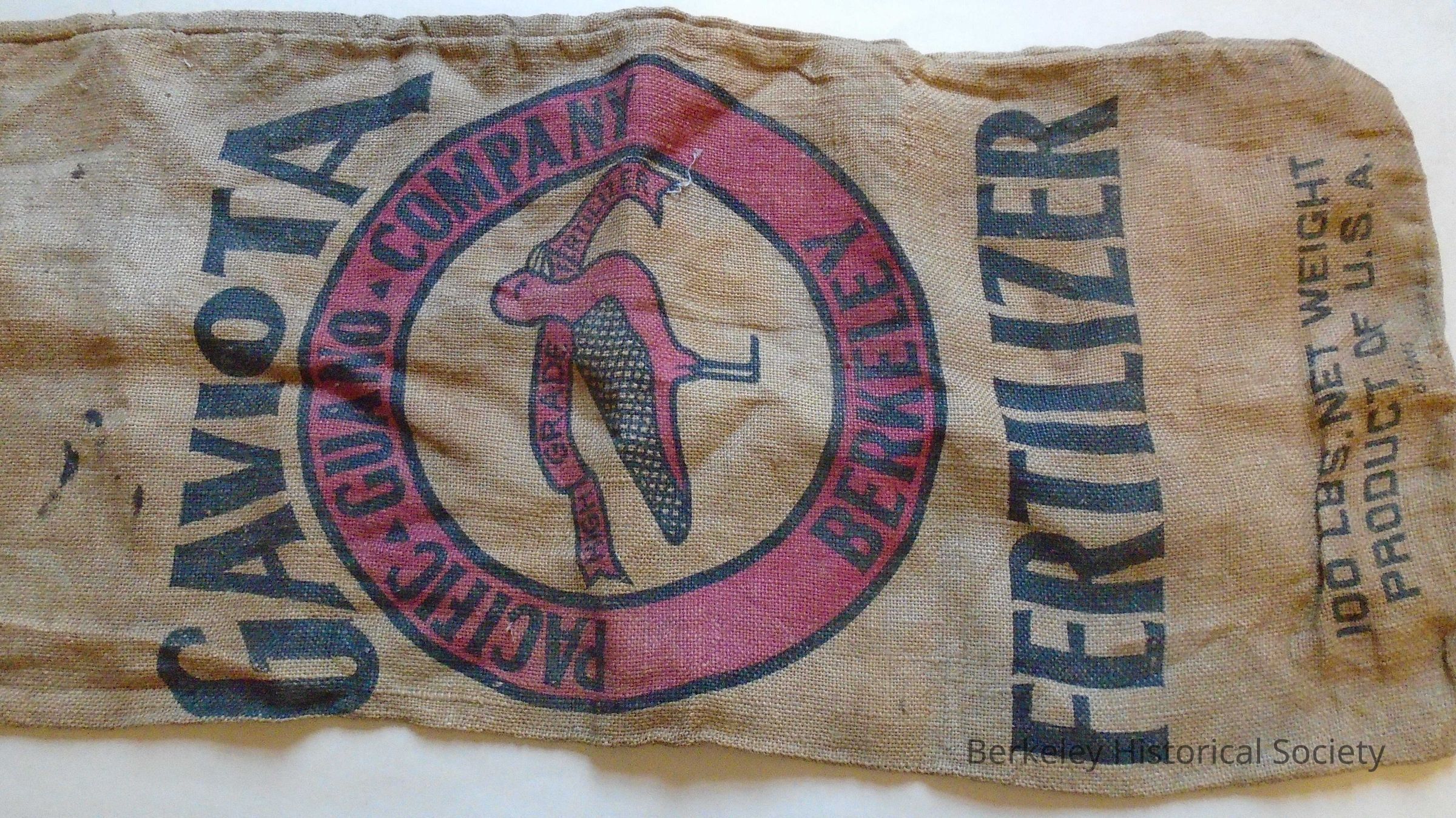 Burlap bag for "Gaviota Fertilizer 100 lbs.". Printed on front: circle in red surrounding a seagull showing "Pacific Guano Company Berkeley, High Grade Fertilizer".