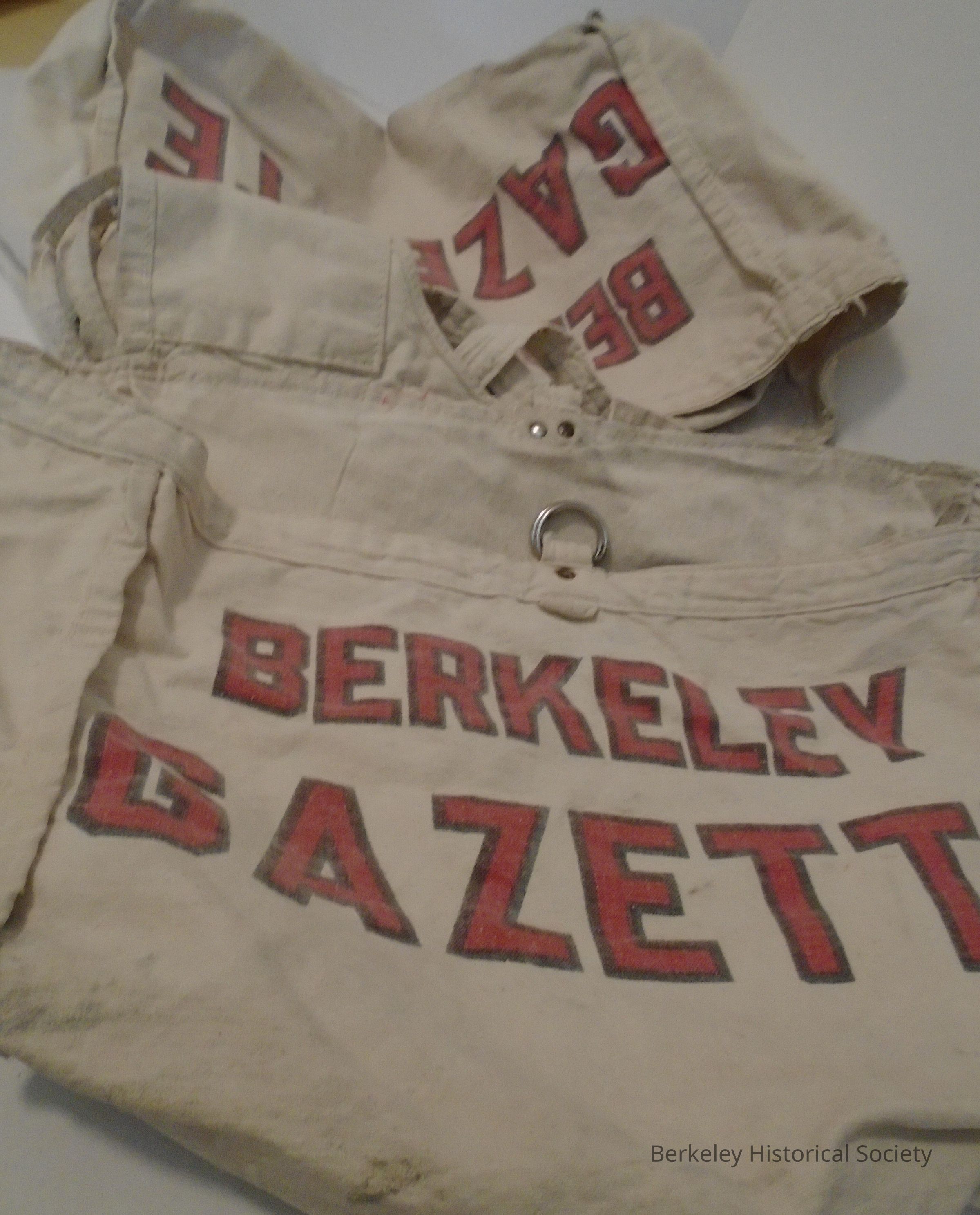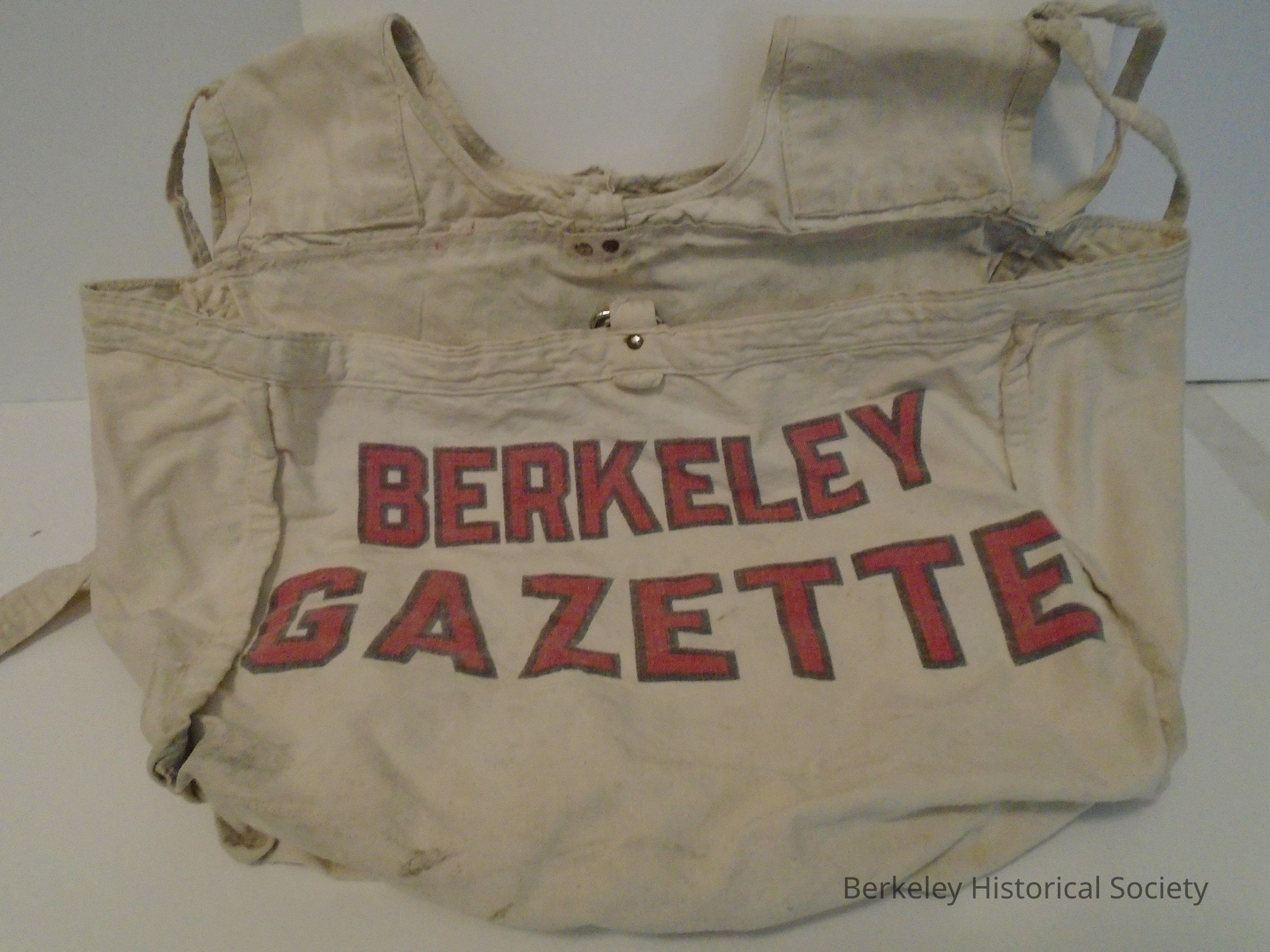 Poncho style cotton canvas newspaper carrying bag. Large pockets front and back. Natural canvas with red and black lettering. "Berkeley Gazette" on both pockets. Arm ties and front and back pocket flaps and straps.