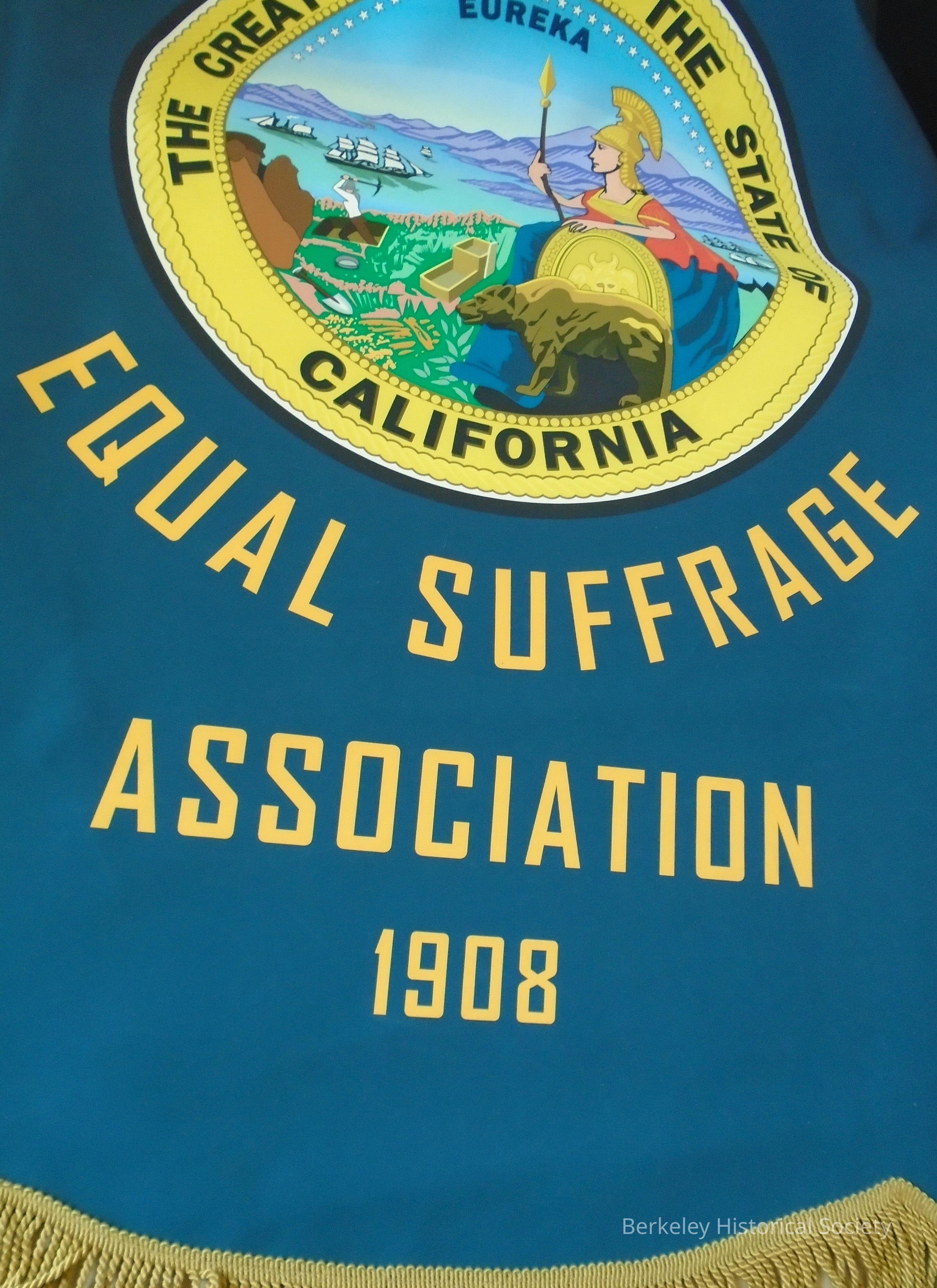 Vinyl dark blue silk screened banner with gold fringe at top and bottom and gold trim on sides. In the middle is The Great Seal of the State of California (in full color). Above it in gold "California" and below it "Equal Suffrage Association 1908". Metal loops at top and metal pole for hanging. Made for the Women Suffrage exhibit at BHS.