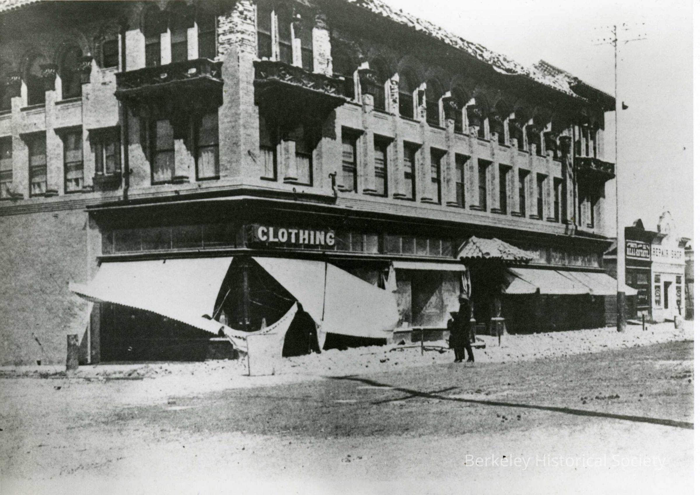Corner store, rubble, fallen awnings. Far view and near view (two photos). 2486 Shattuck Avenue.Made/Created