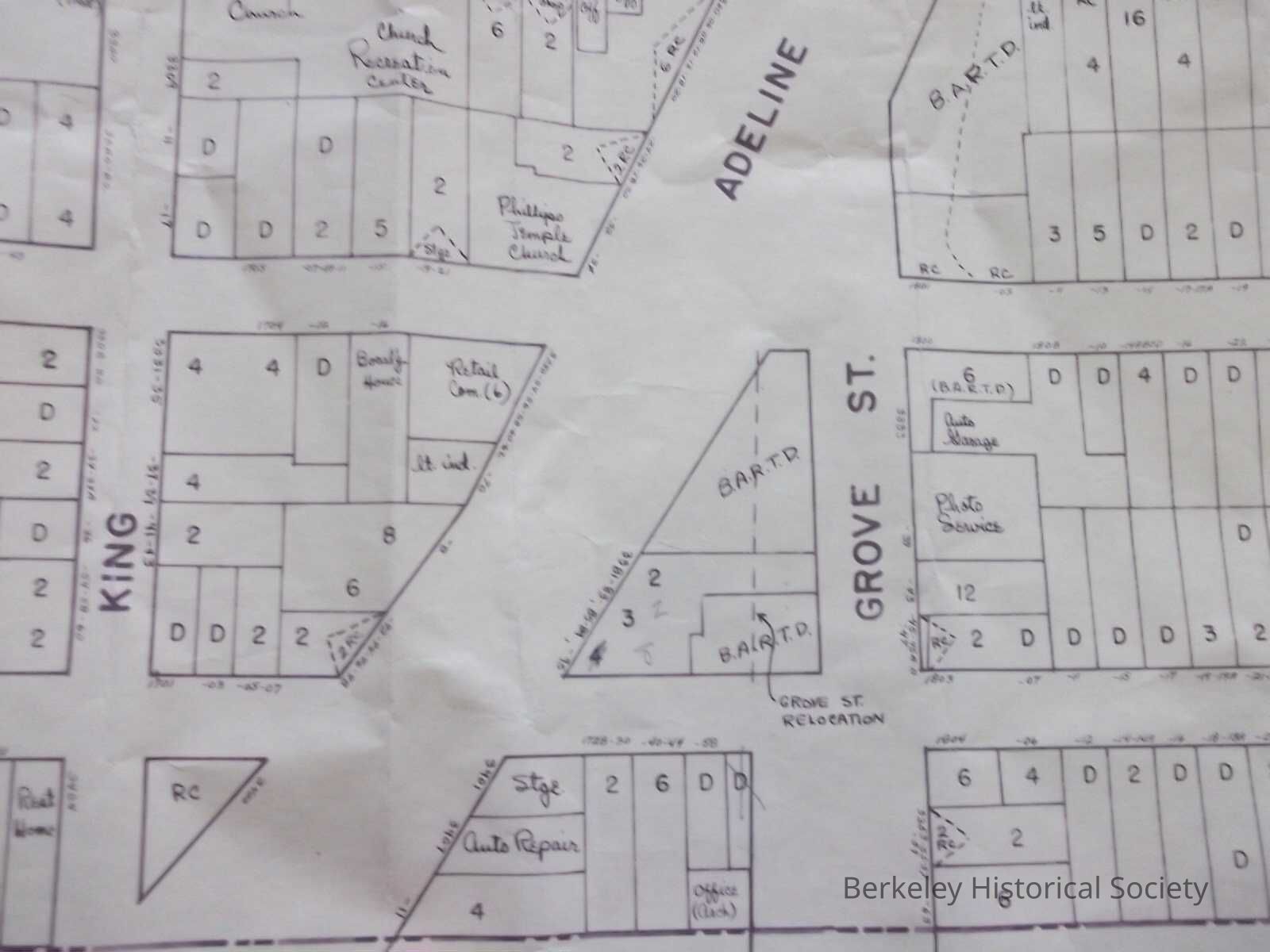Title in pencil on map. Planning map for BART, shows property at Adeline and Grove for BART, shows some stores, extends from Prince Street on the north to 62nd Street on the south.