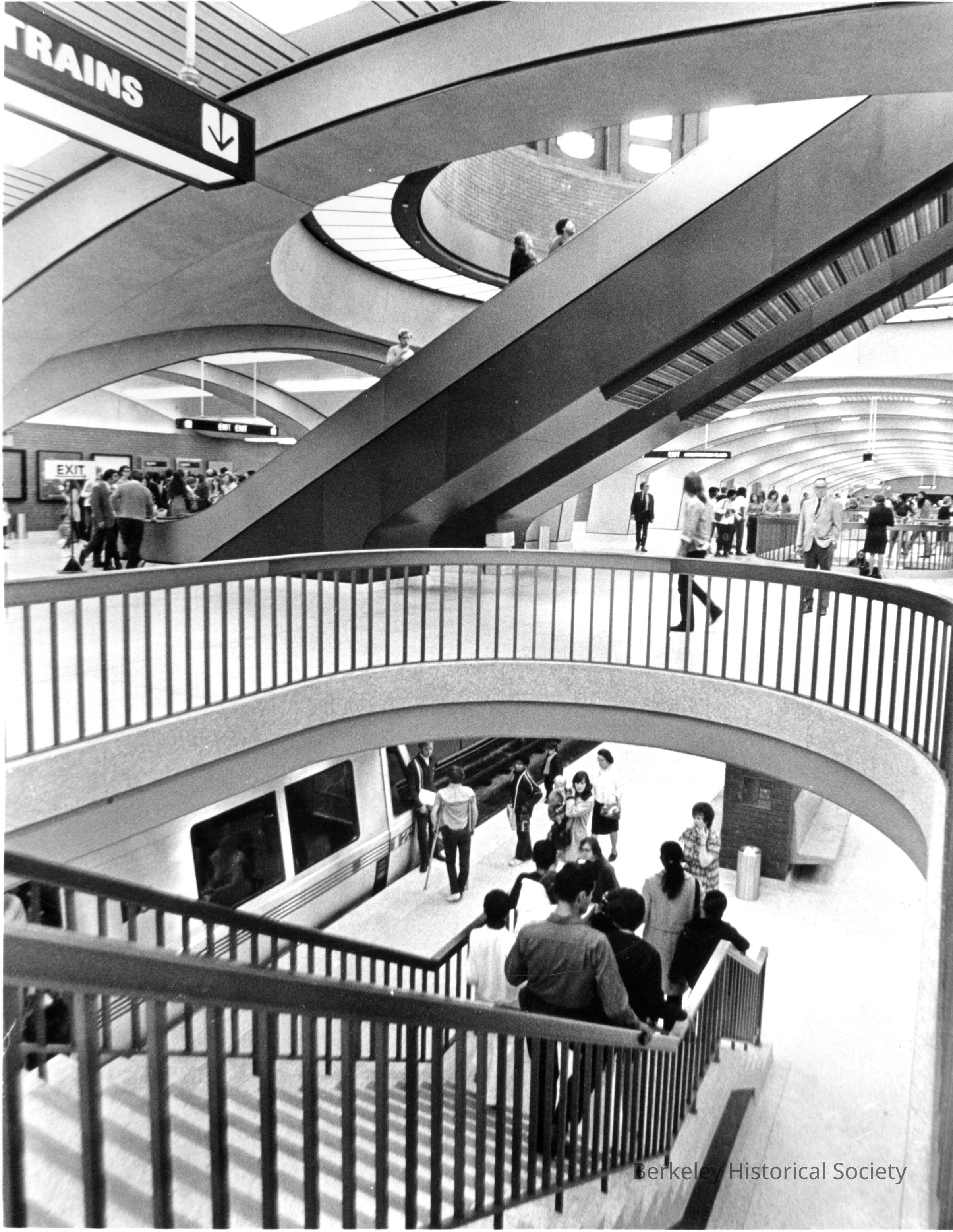 Interior of BART station, showing escalator up, stairs down, passengers boarding train below.Other Names and Numbers