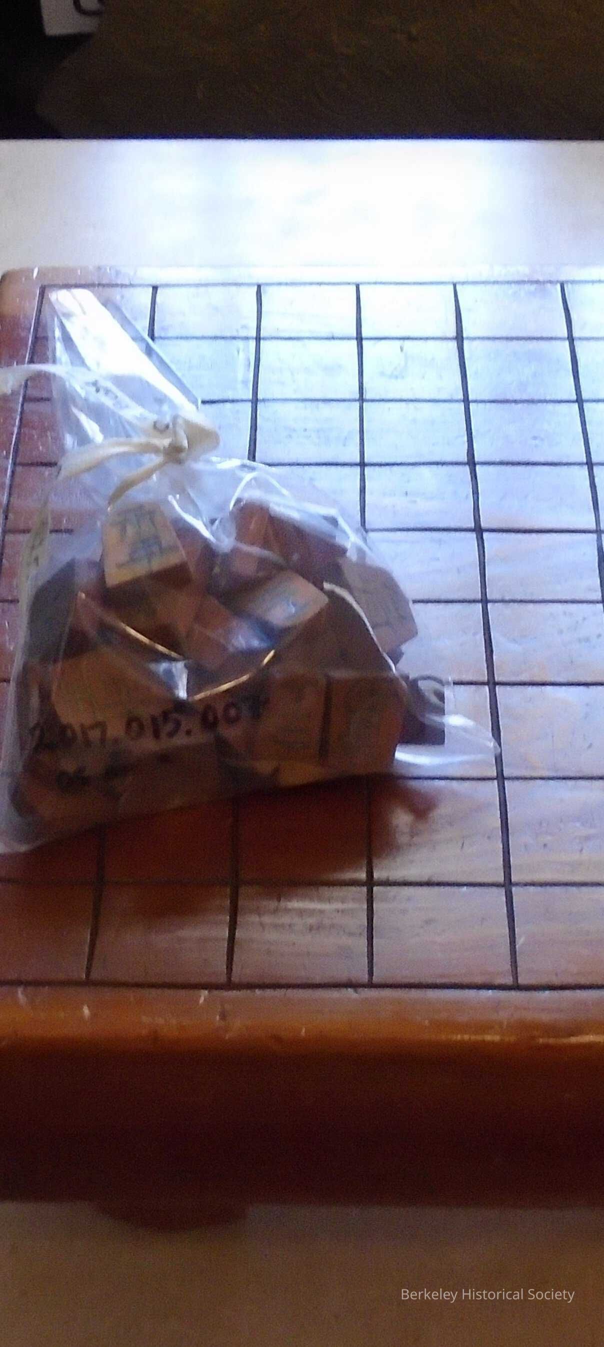 Wooden Shogi game tiles. Set of 41 hand carved wooden tiles made in a Japanese internment camp during WWII. Japanese characters on each. See also 2017.015.006 Shogi Game Board. The game was used after the war by evacuees who temporarily stayed at a house at 1813 University Avenue in Berkeley. Pieces have specific role (as in chess).