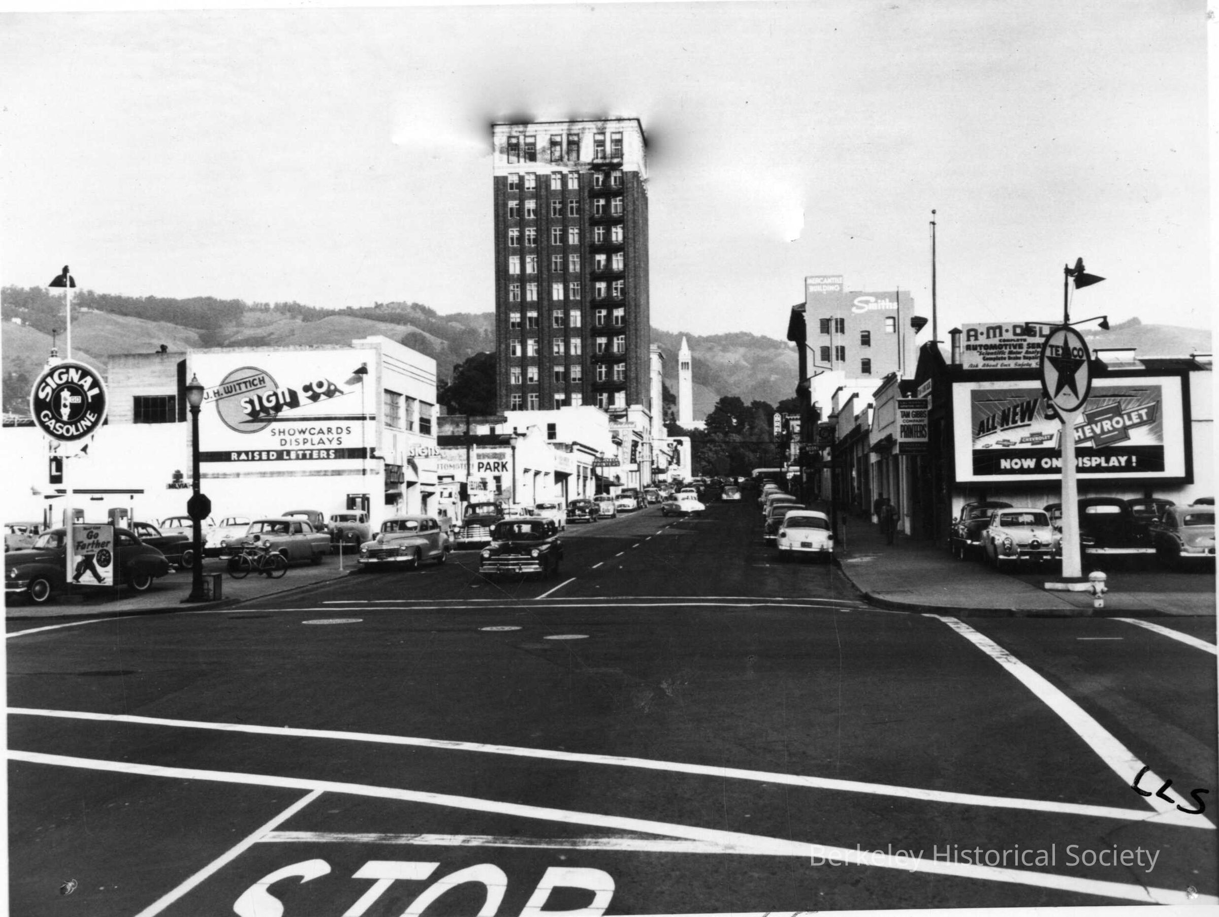 Signal Gasoline station on left; Texaco Station on right. Wells Fargo building and Campanile in distance. "File Copy' stamped on front of photo.
