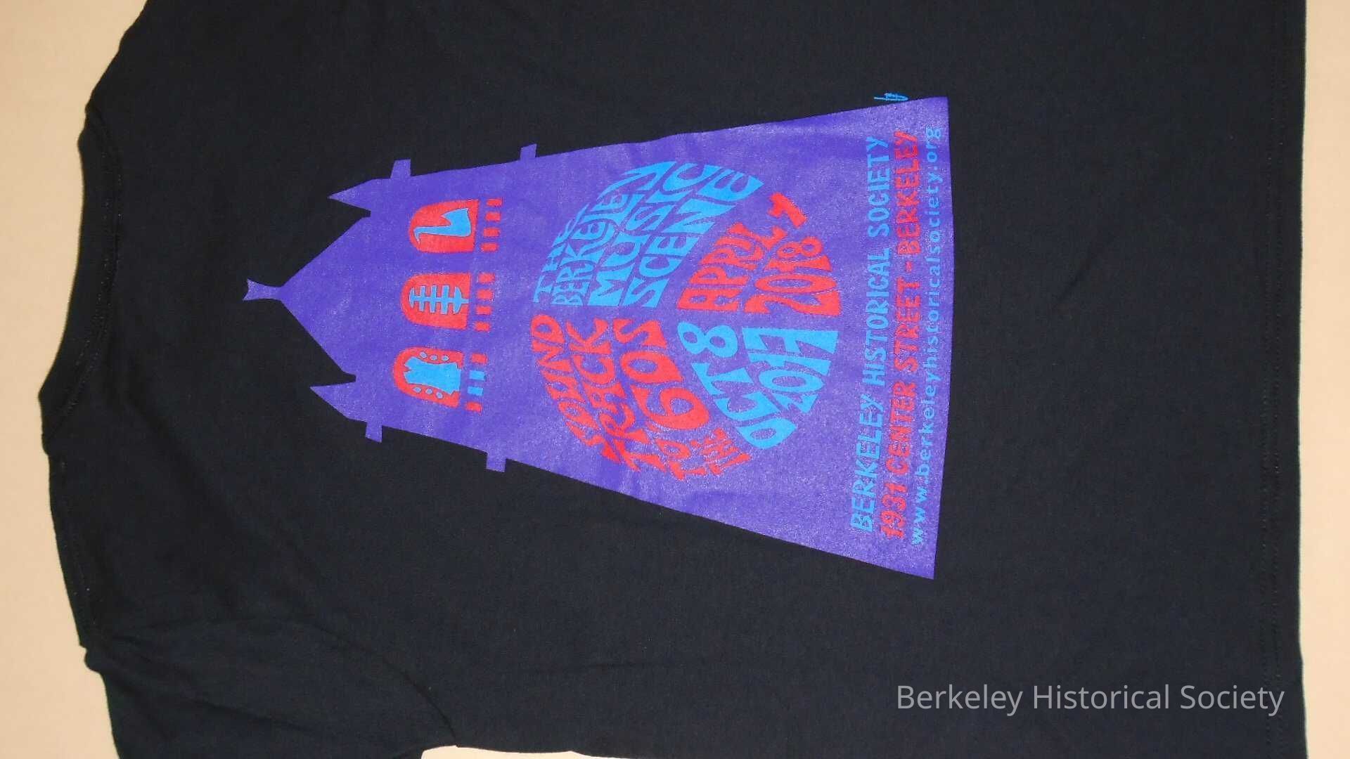 Black, short sleeved, cotton T-shirt. Front shows "Berkeley Historical Society" in red. Back shows outline of Campanile in purple with red "Soundtrack to the 60s, Berkeley Music Scene", advertising exhibit at Berkeley Historical Society 1931 Center Street from Oct 8 2017 to April 1 2018. Size small. Made by Customlink.