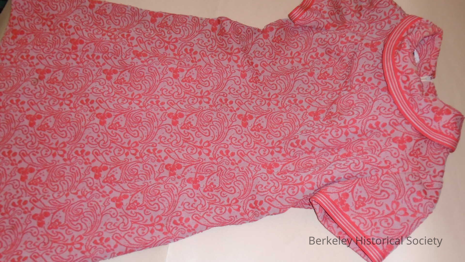Orange and beige, flared skirt, short sleeve, print dress. Synthetic knit, zipper down back, round collar. Label: Leslie Fay Knits. Worn by Shelley Rideout.Lexicon
