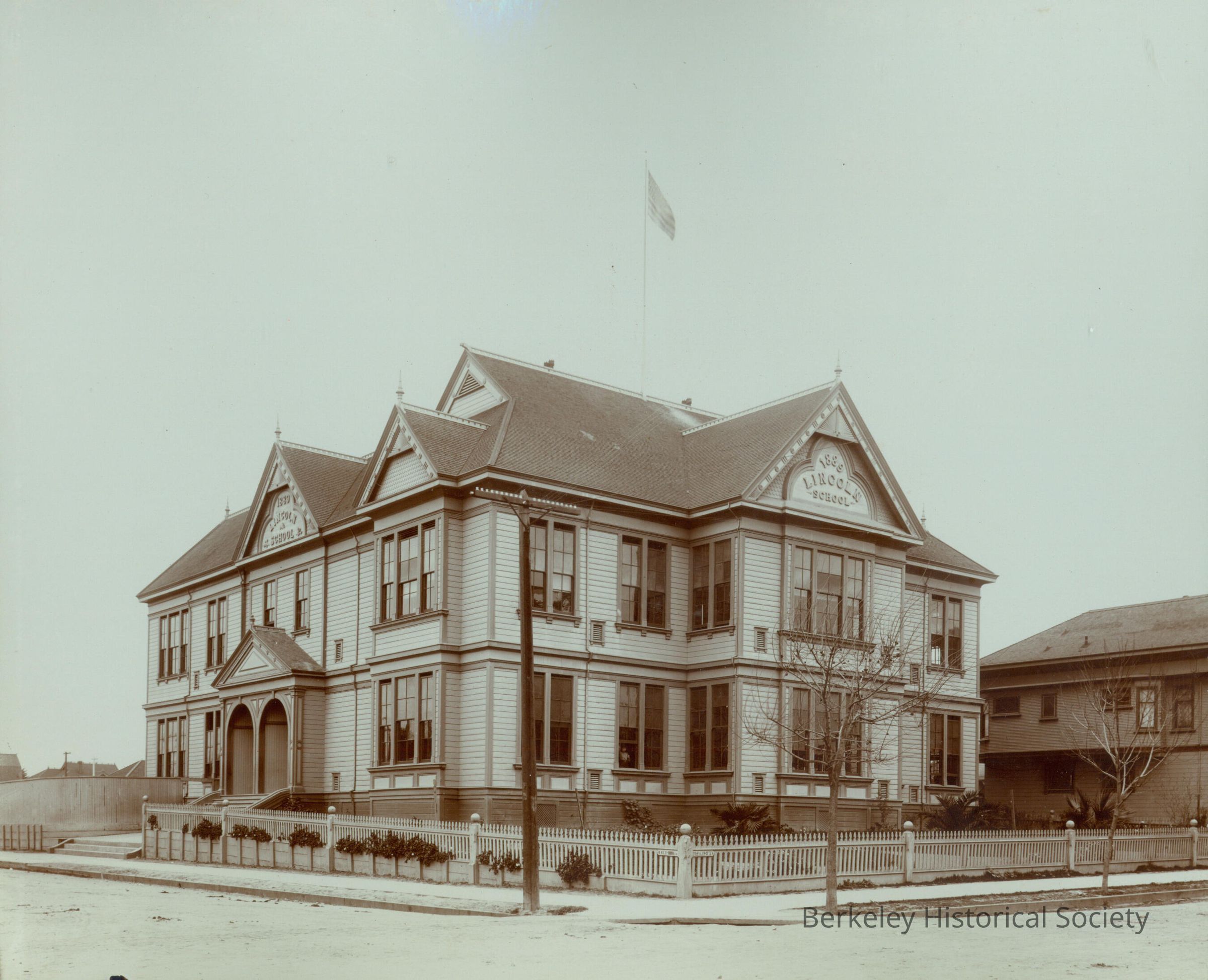 View of building diagonally across intersection; under eaves: "1889 Lincoln School"Made/Created