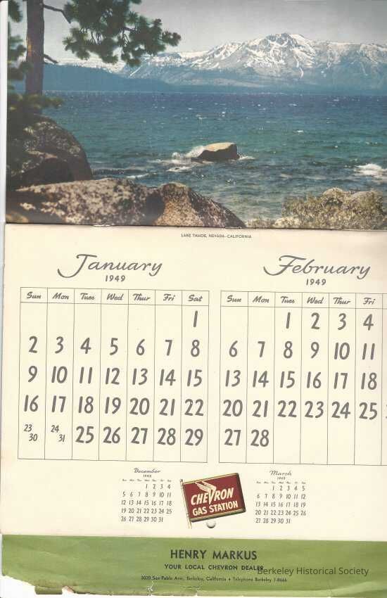 Paper hanging calendar with "Greetings for 1949" on the front in a circle of western type pictures (stage coach, totem, cactus). Henry Markus, your local Chevron dealer, 3020 San Pablo Ave., Berkeley, California Telephone Berkeley 7-8666. Pictures are outdoor scenes & parks.Lexicon
