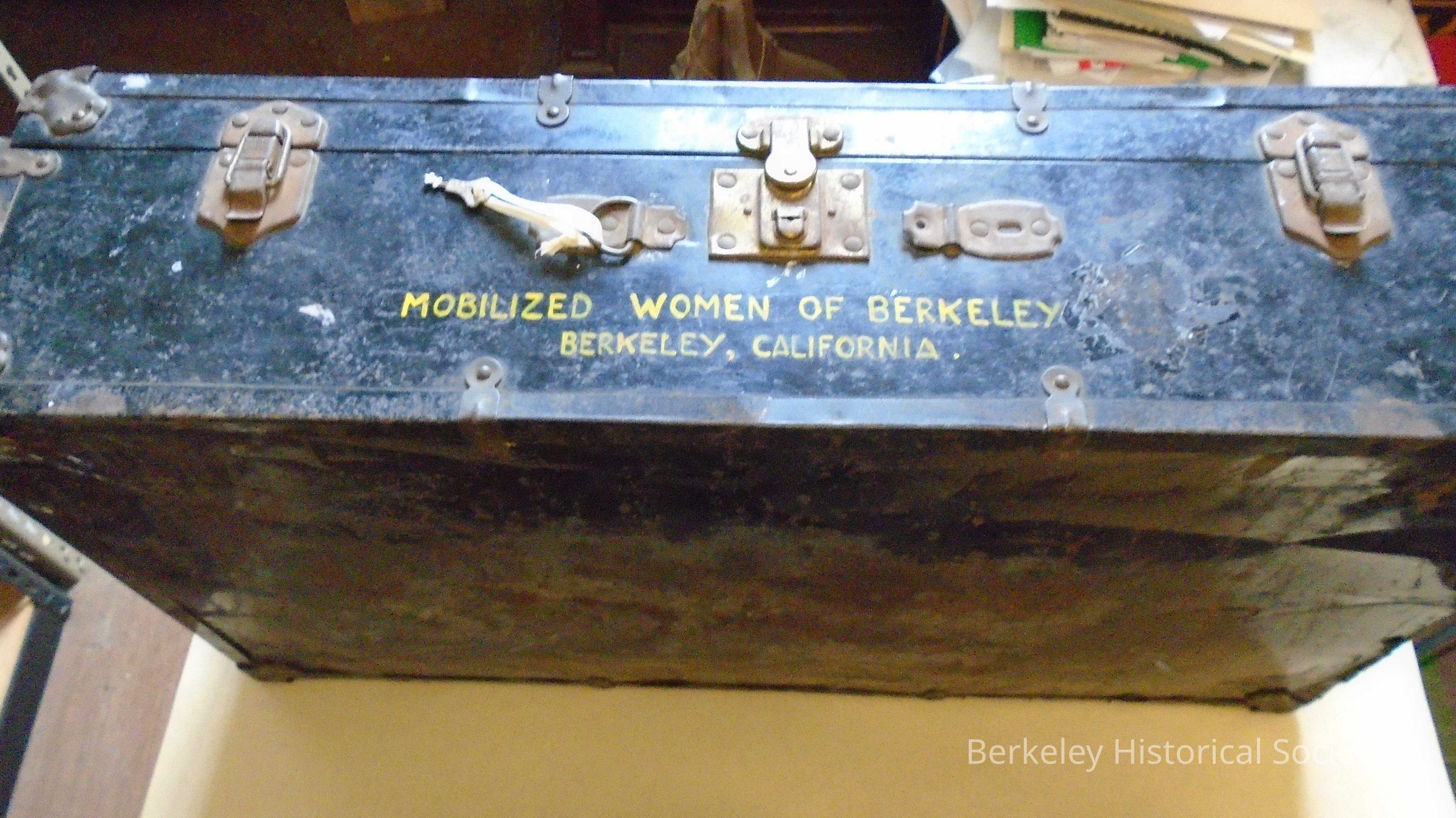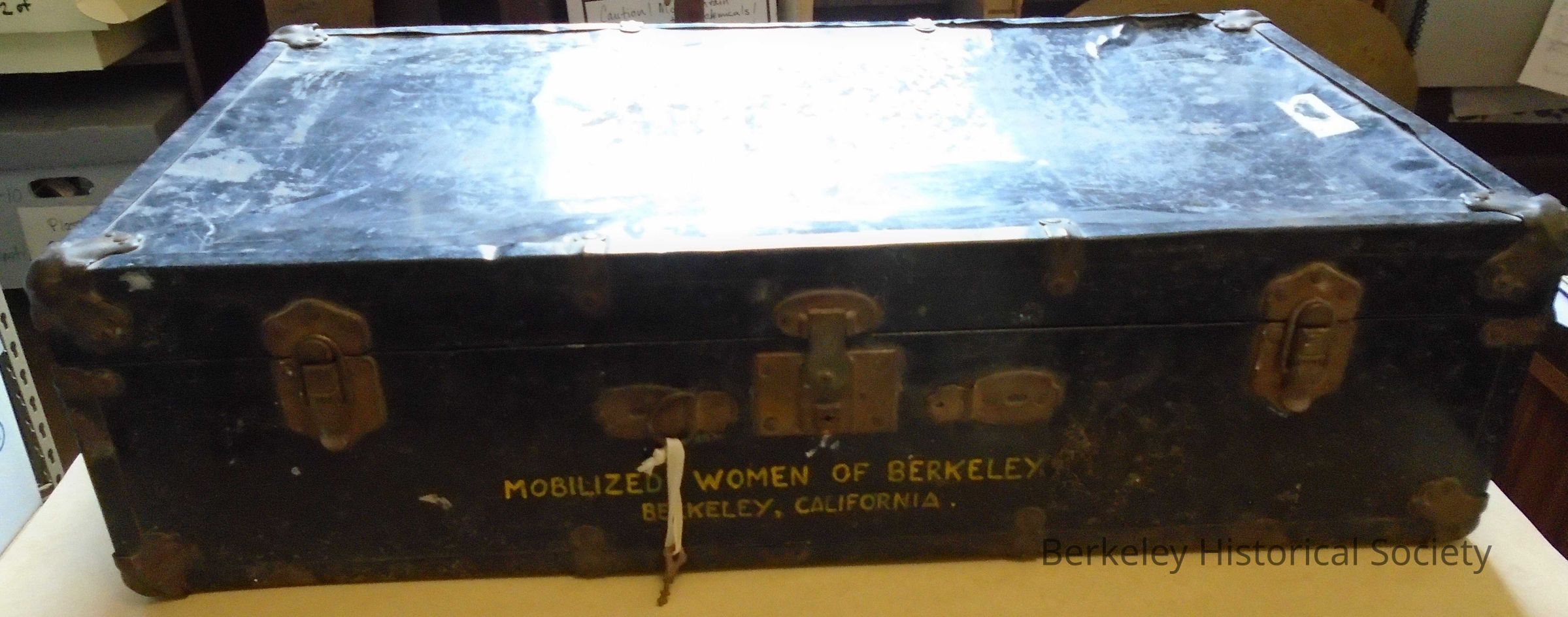 Black metal trunk with paper and wood lined inside. Paper is blue and beige print. 2 hinges on back and 2 snap locks and 1 lock with key in front. Handle is missing. Painted on outside of trunk: MOBILIZED WOMEN OF BERKELEY, BERKELEY, CALIFORNIA.