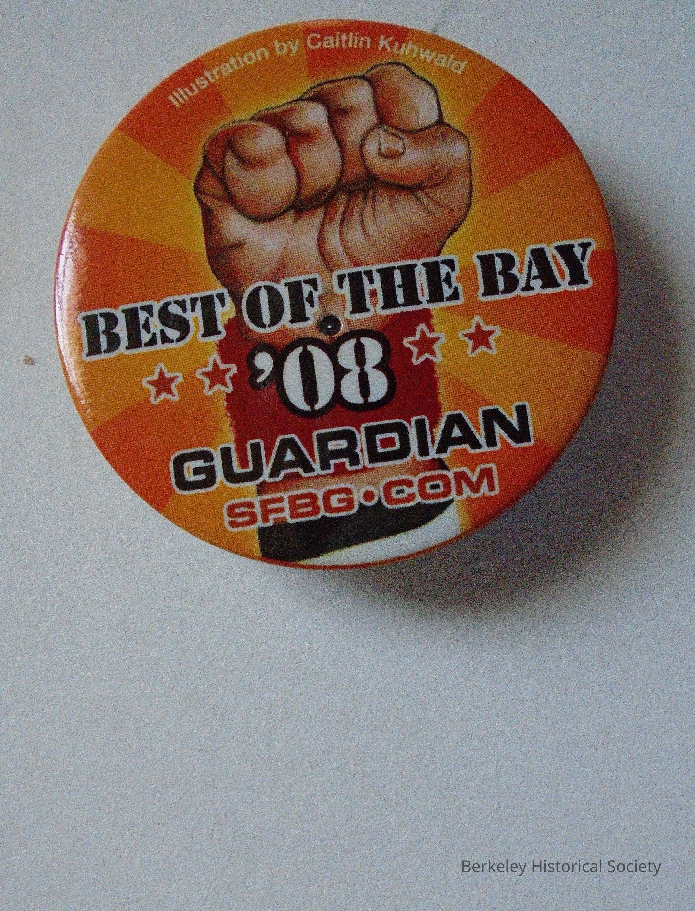 Round metal button with a fist and "BEST OF THE BAY '08 Guardian SFBG.COM". Orange with black and rust colors. Pin on back and battery to blink light in middle. Collected by J.B. Neilands, Professor at UC. Ran on Citizens Party ticket in l967. He died in 2008.