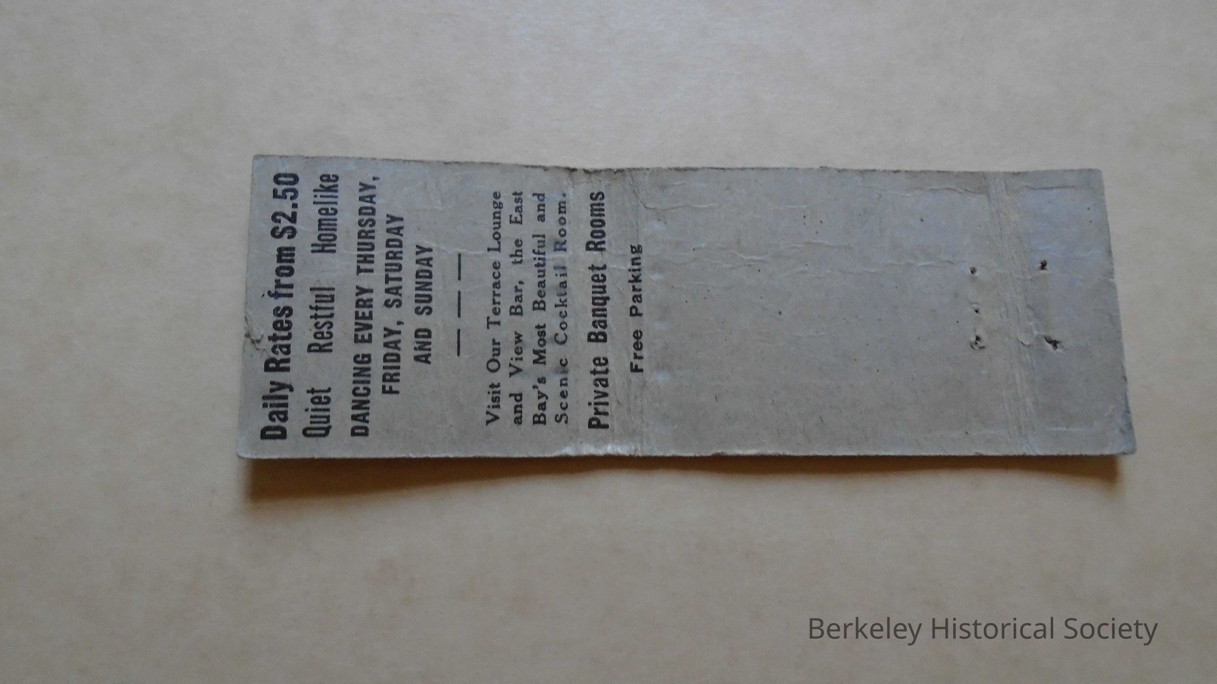 Cardboard matchbook (flattened, no matches) of Hotel Claremont, Berkeley, California. Silver, green, yellow picture of Hotel on front. Back shows rates "from $2.50" and advertisement for Terrace Lounge.Lexicon