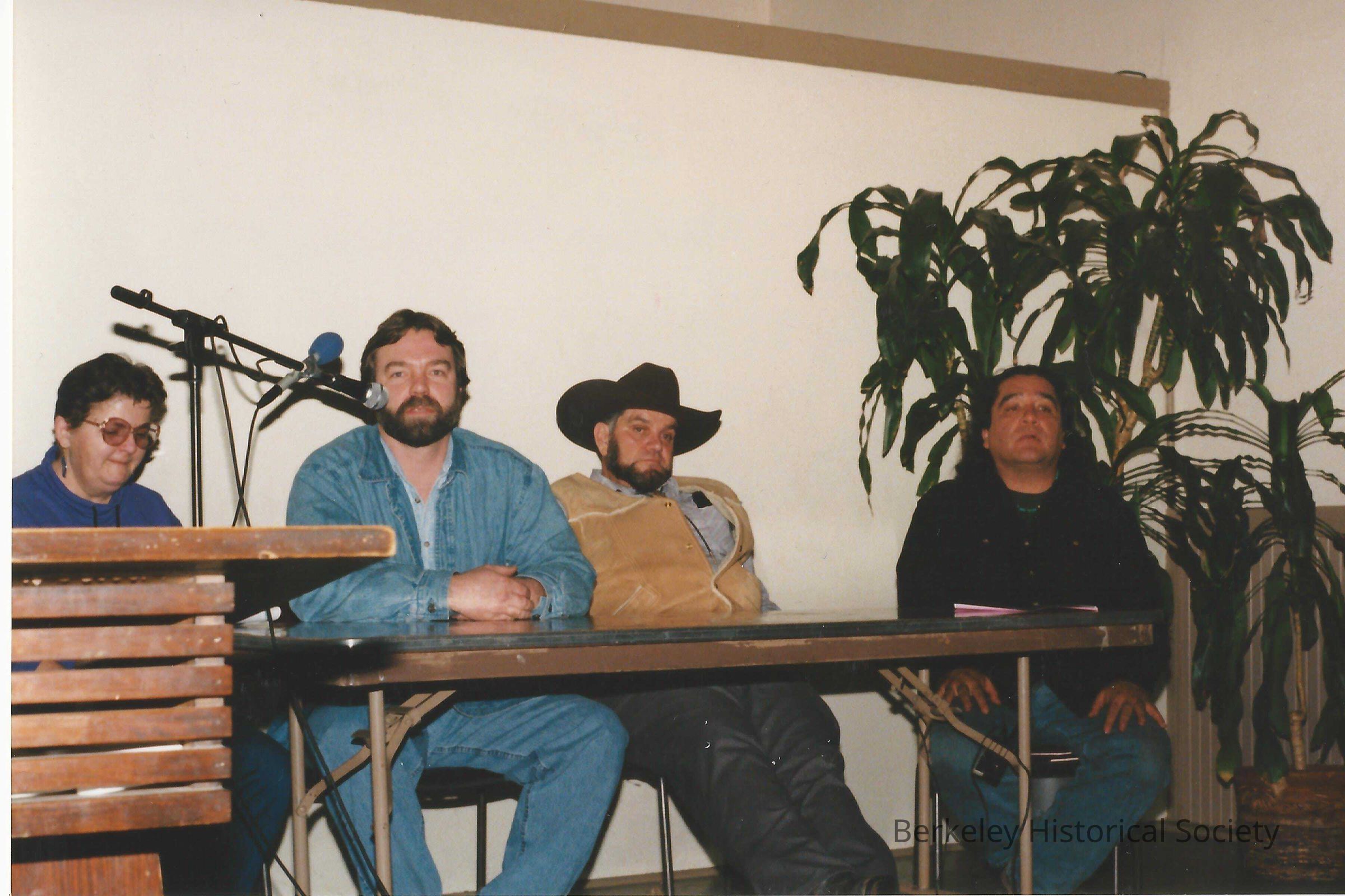 Taken at Unitarian Fellowship Hall. Four people at a table; on verso "Anonymous Jurors"? Part of Berkeley Folk Festival1997? Also on verso: Chris Cottrell. Name with asterisk; Is he one near microphone? Dated" 2/16/97.