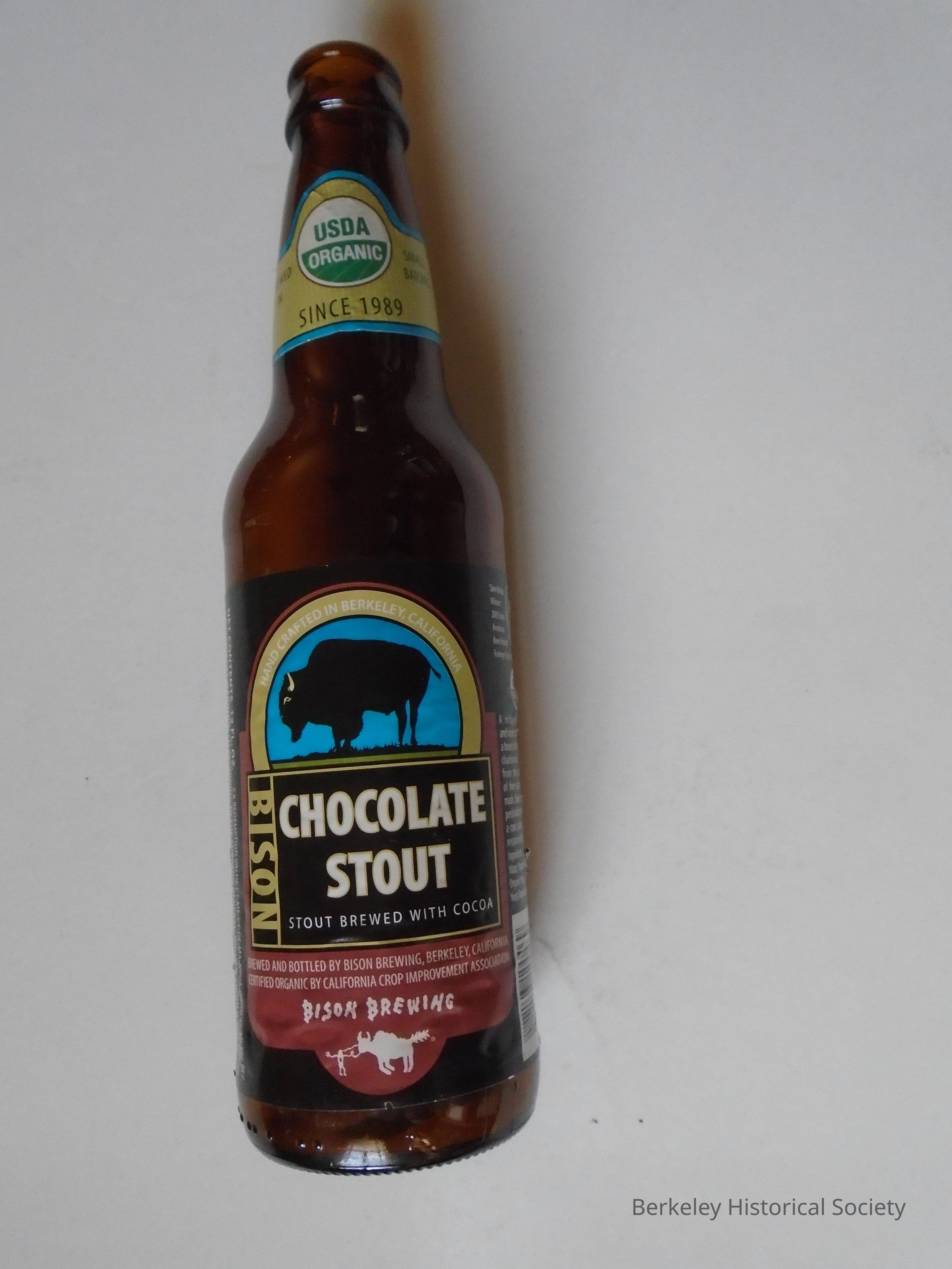 Brown glass beer bottle with a brown, black and blue paper label with picture of a bison for USDA organic, Chocolate Stout, Bison Brewing. 12 fl oz. Located at 2030-5th St. (at Addison), Berkeley, CA (silver medal winner in 2005). Brewery started in 1989.Lexicon