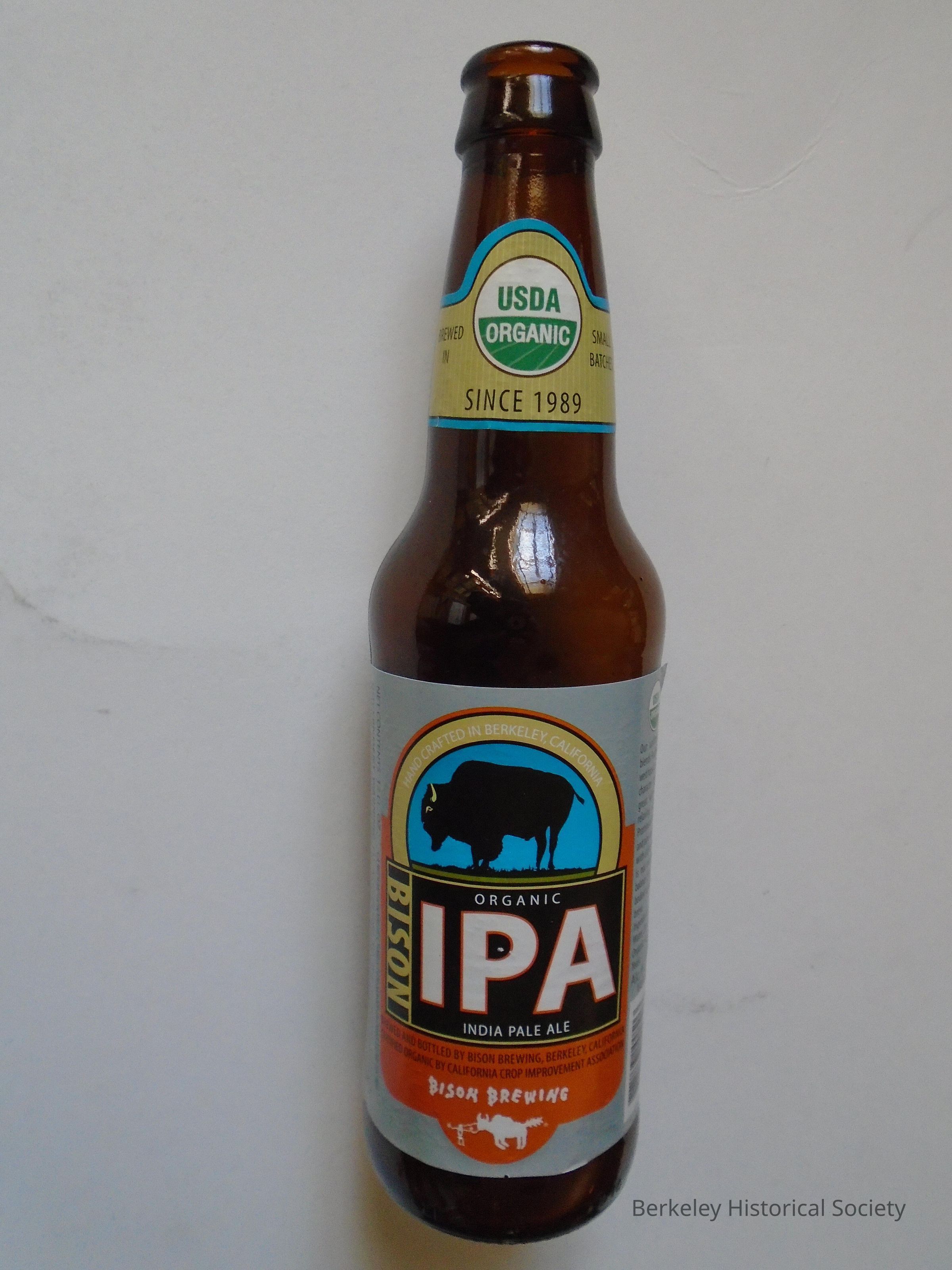 Brown glass beer bottle with an orange, black and blue paper label with picture of a bison for USDA organic, IPA, Bison Brewing. 12 fl oz. Located at 2030-5th St. (at Addison), Berkeley, CA Brewery started in 1989.Lexicon