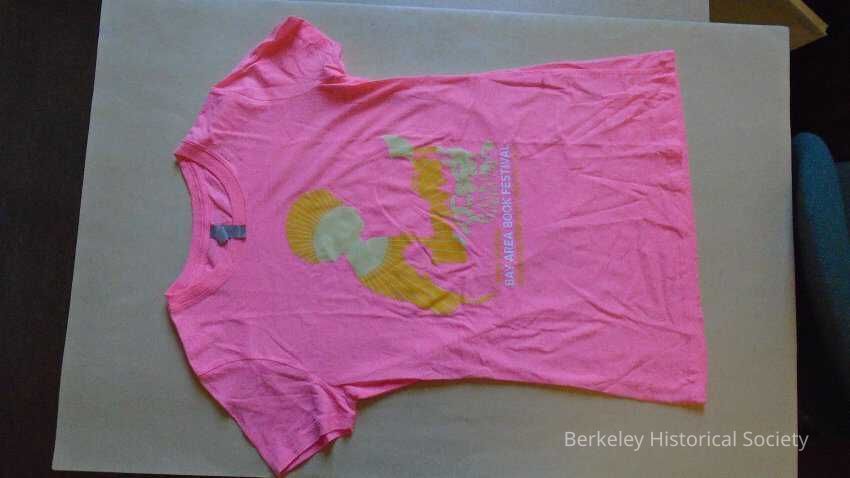 Pink, short sleeved, cotton & polyester T-Shirt, sized XL (child's). Picture in yellow of woman's head, advertising: "Third Annual Bay Area Book Festival Downtown Berkeley/June 3 & 4, 2017".