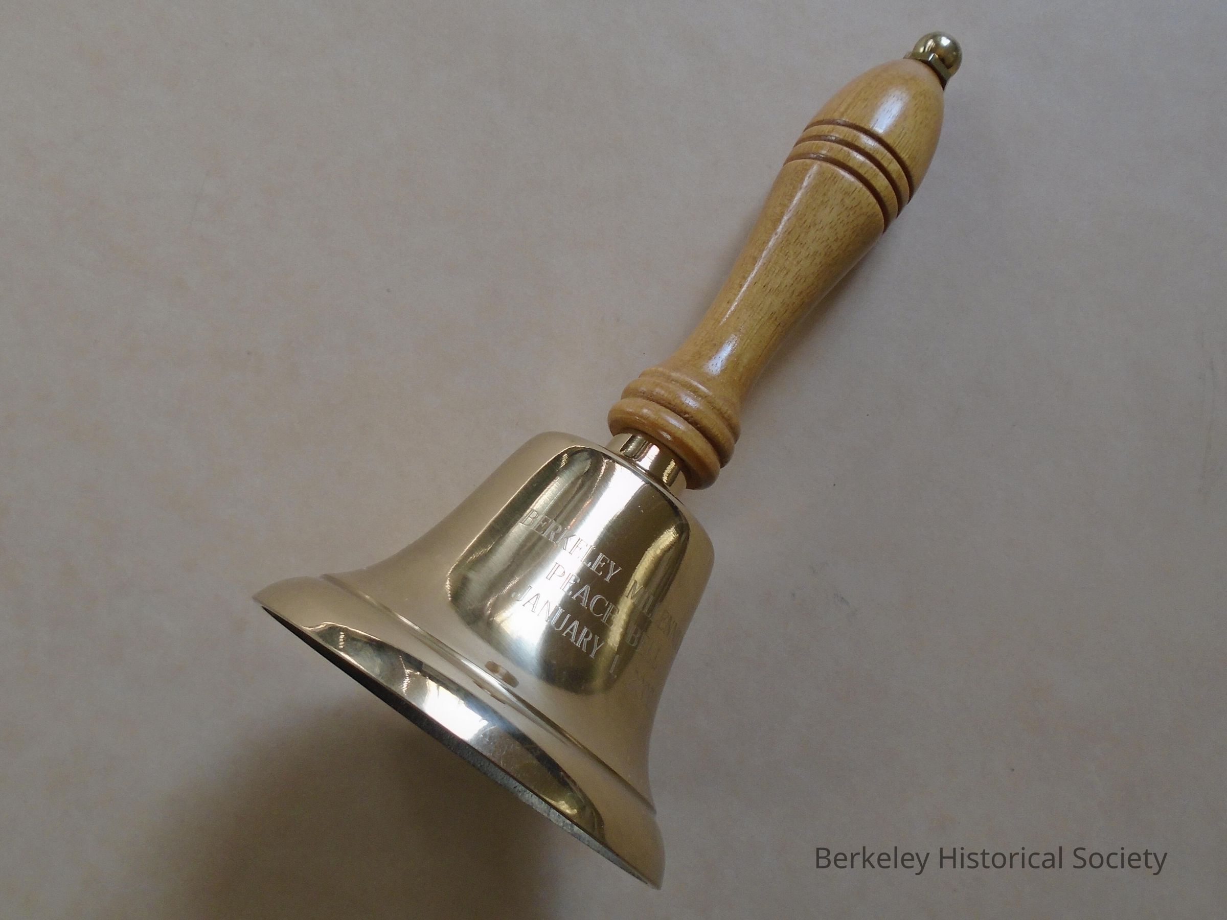 Official 'Berkeley Millennium Peace Bell' from January 1, 2000. The bell itself appears to be cast iron, with a polished, gold-painted exterior. 3" tall, 3.5" diameter. Etched onto one side is 'Berkeley Millennium Peace Bell January 1, 2000'. The handle is 4" high, made of polished wood, with a small gold knob at the top. The bell comes with an official Certificate of Authenticity from the City of Berkeley certifying that "the Berkeley Historical Society is the owner of Berkeley Millennium Peace Bell #5 of a limited edition of 500."Made/Created