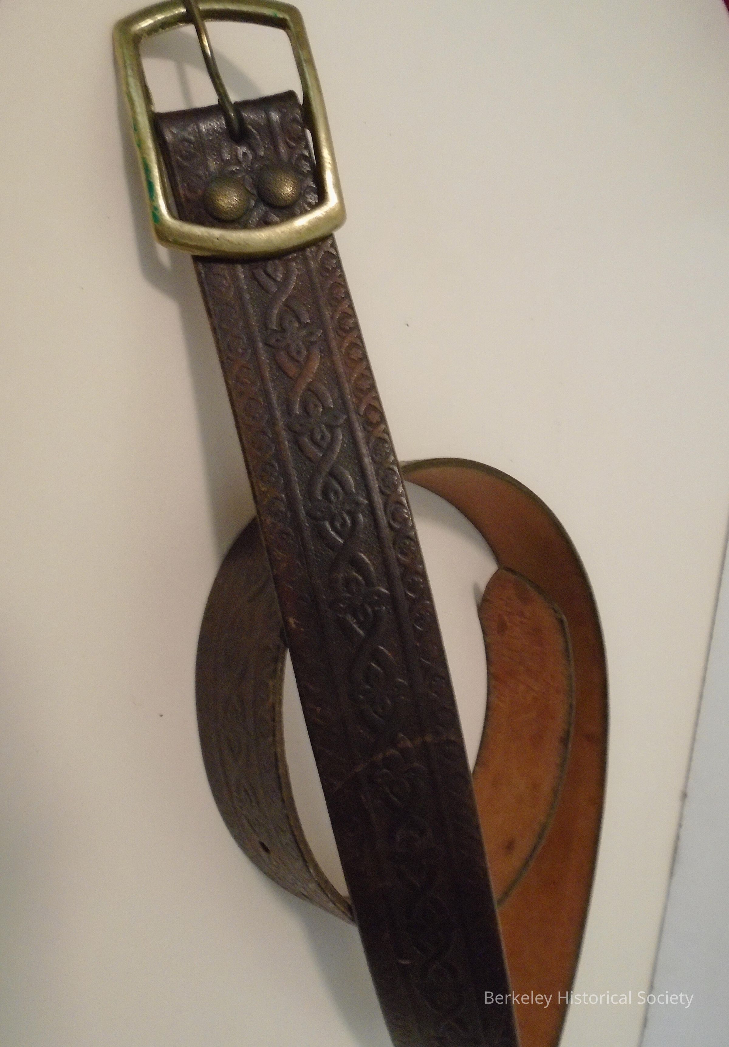 Leather belt with rectangle shaped brass buckle. Leather is darkened and embossed with a design of twinning and 4 petal flowers. Edges show circles with a flower in the middle. Buckle is stamped "solid brass" and the number "2". Worn (and probably made) in the 1960s in Berkeley.Made/Created