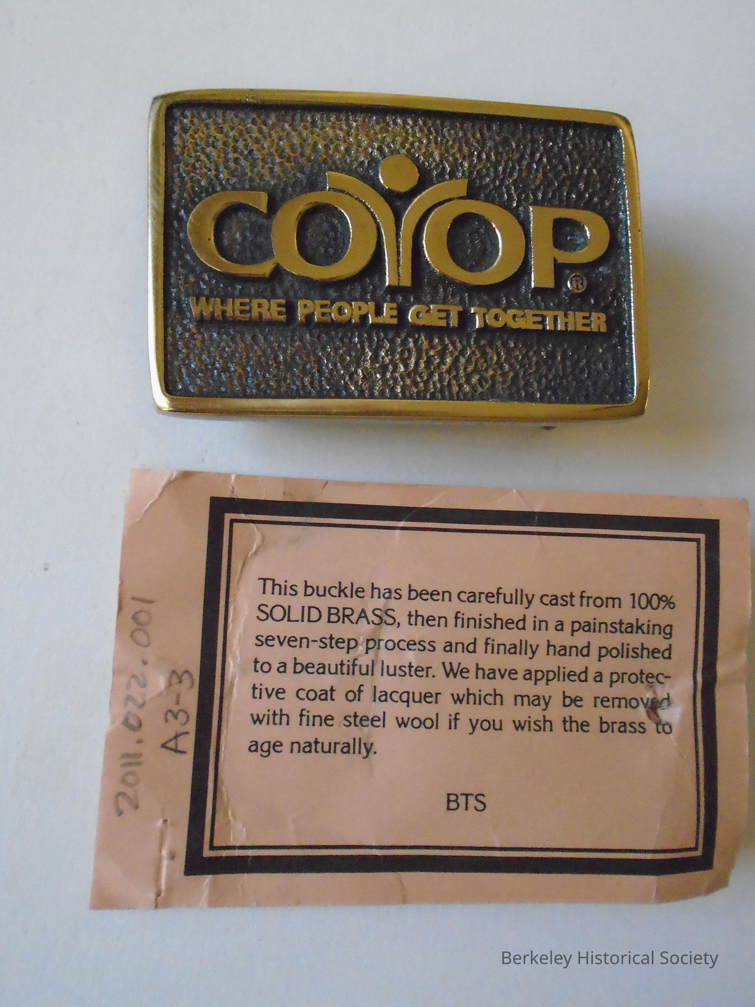 Square, brass belt buckle. In relief: CO-OP WHERE PEOPLE GET TOGETHER. In a packet with original information card about how buckle was cast and processed.