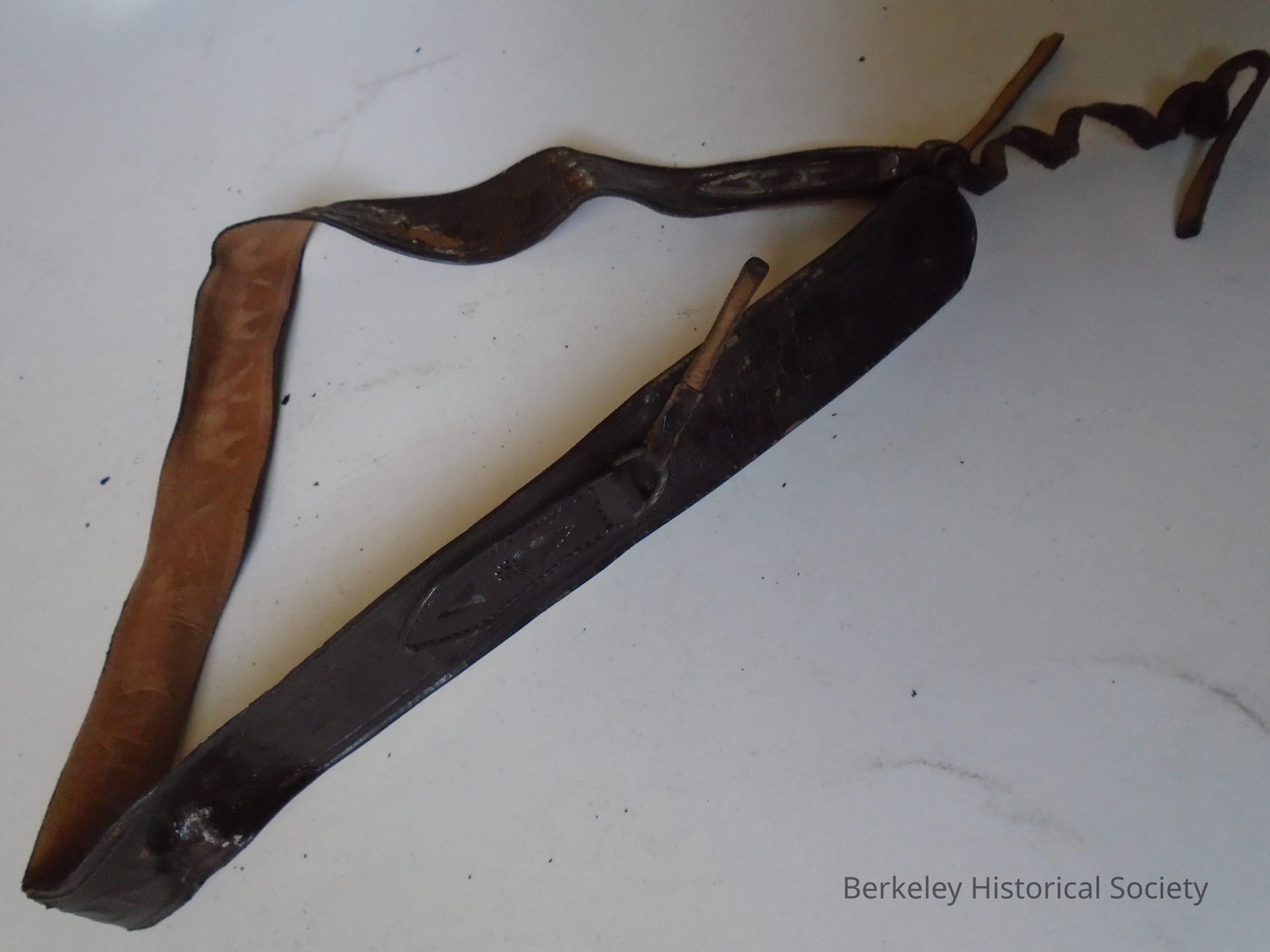 Child's brown leather belt or strap/band stamped with 5 bears, flowers, "California 1927". Gromets are hooked to leather tabs at either end of the belt and these in turn are hooked/tied with a thin leather strap. (Only about 1" of strap remains).