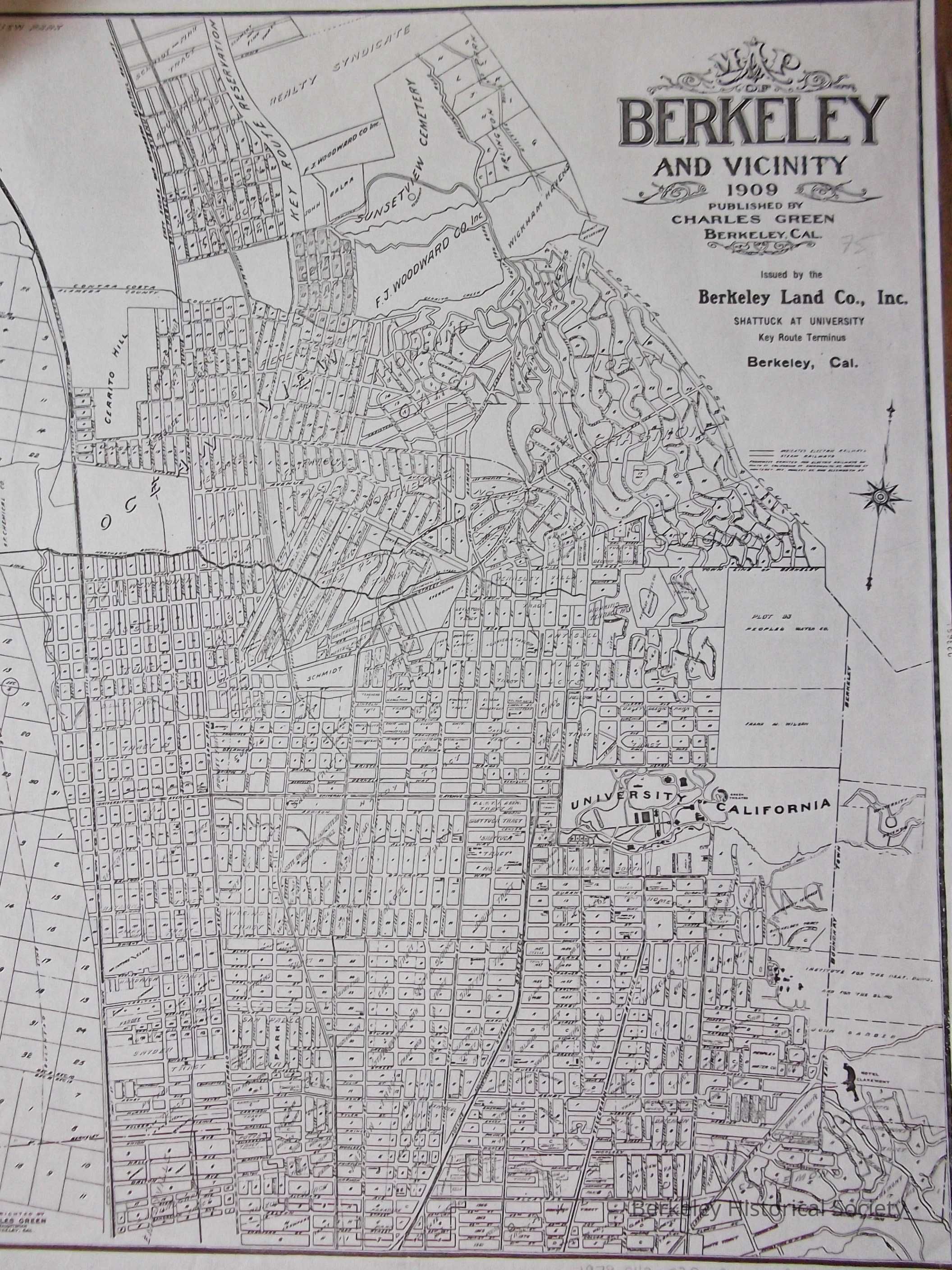Shows city streets, parcel numbers, steam realways, electric railways (Key Route). Issued by the Berkeley Land Co., Inc.