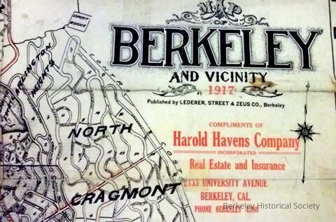 Compliments of Harold Havens Co. In larger text North Cragmont. Street listings on reverse side. Similar map 1978.043.14. Streetcar lines shown. City of Berkeley is shaded. Published by Lederer, Street & Zeus Co