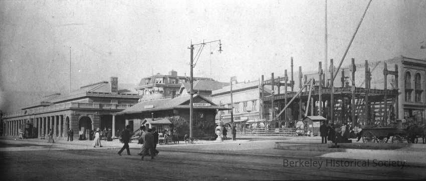 Bank building to the right, depot to the left, Shattuck Avenue and Center.