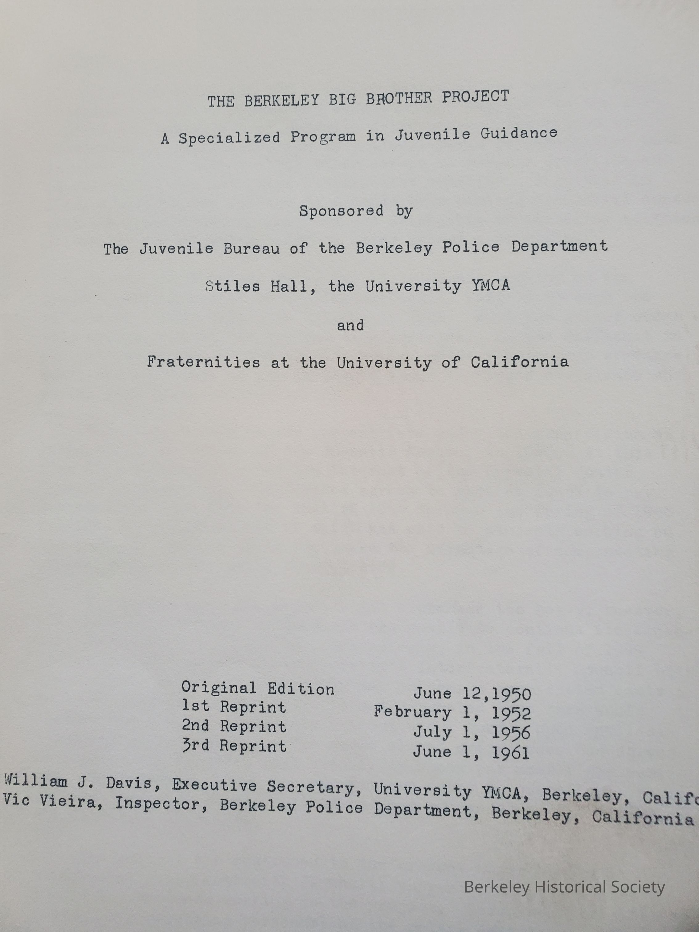 "Sponsored by the Juvenile Bureau of the Berkeley Police Department, Stiles Hall, the University YMCA, and fraternities at the Universit y of California. William J. Davis, executive secretary of the University YMCA, and Vic Vieira, Inspector, Berkeley Police Department.