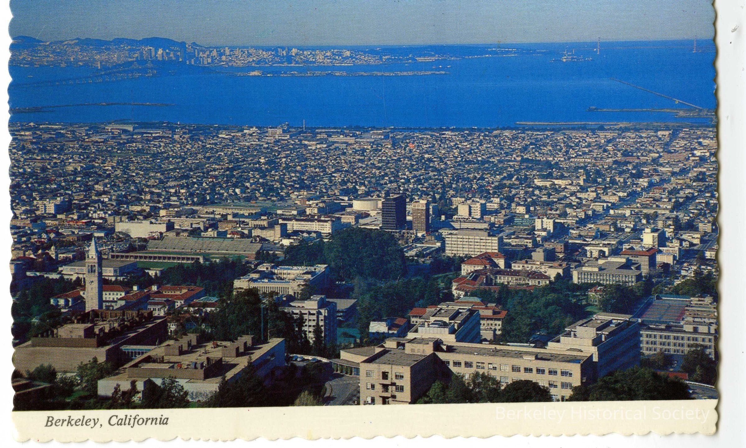 Aerial photograph of Berkeley with the bay in the distance. Postcard has scalloped edges and white bottom border.