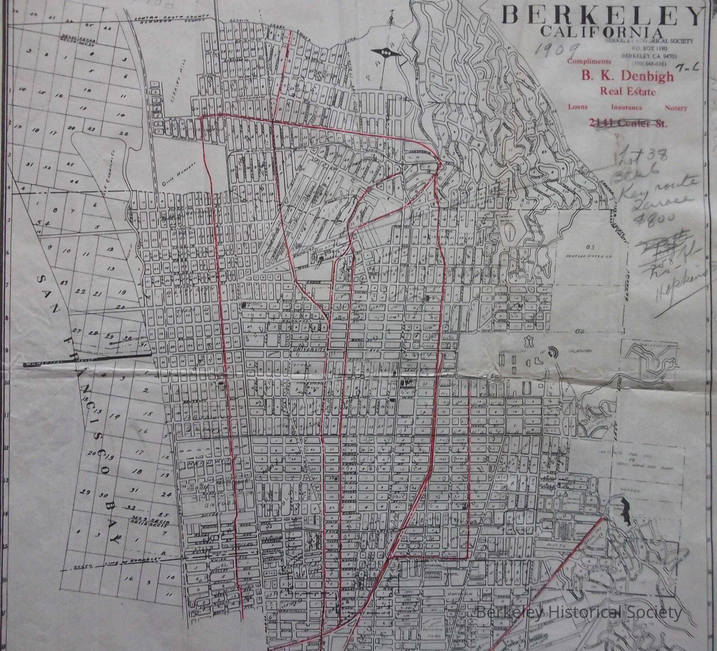 Shows city streets & parcel numbers, street cars, S.P. ferry systems, Key Route and railroads. Some transportation lines in red. Street index on right side.