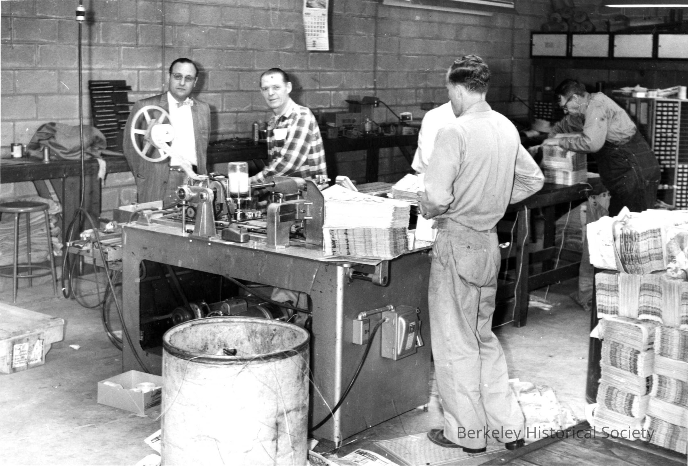 Men stacking and binding together stacks of the Berkeley Daily Gazette for distribution. 2048 Center Street.