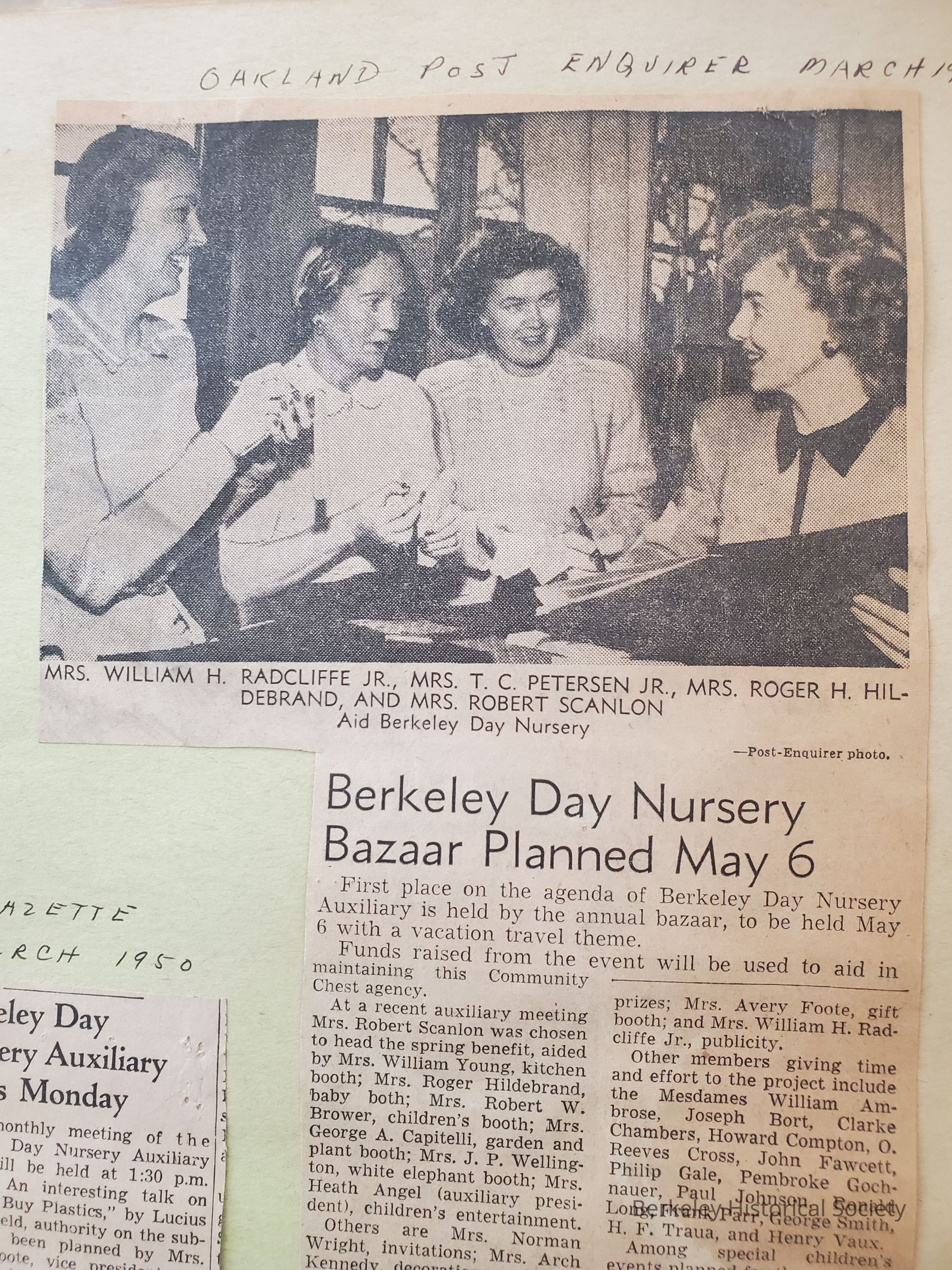 Publicity scrapbook of Berkeley Day Nursery Auxiliary1947-1964. Wood hinged cover with approximately 60 paper pages of newpaper clippings, photographs and misc. programs. Includes a manila folder with additional (loose) clippings, letter and misc 1964-1972. Well documented. Some items from 1972 identify the Berkeley Auxiliary of the Child Welfare Services.