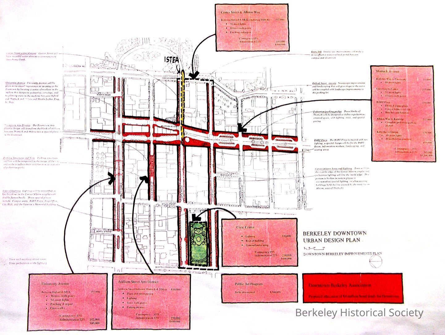 Proposed allocation of $4 million bond funds for downtown. Part of a larger document for the spending of an ISTEA grant. Streets with proposed improvements marked in red, with boxes indicating details of work proposed.