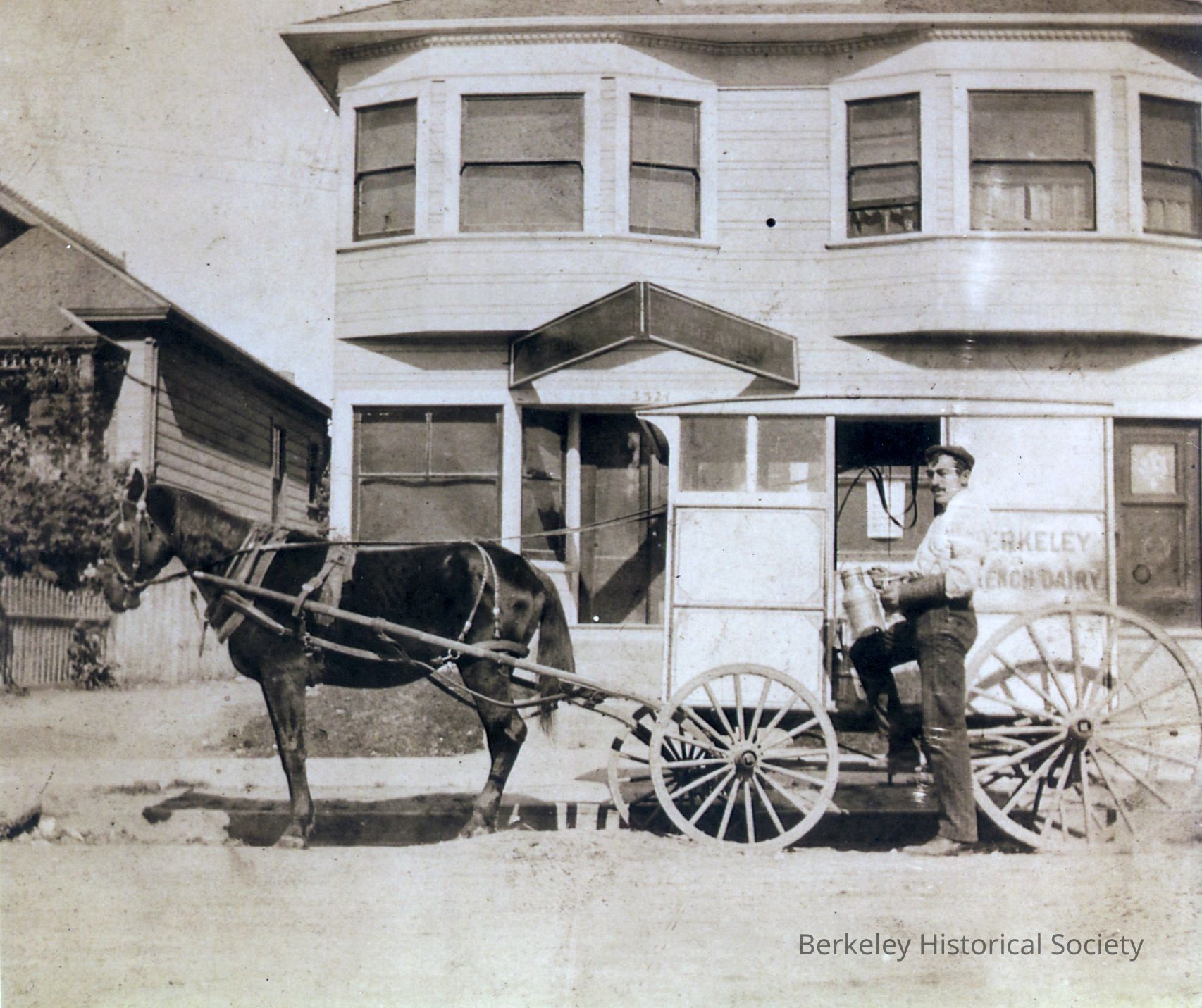 Horse drawn delivery wagon; driver standing alongside.Other Names and Numbers