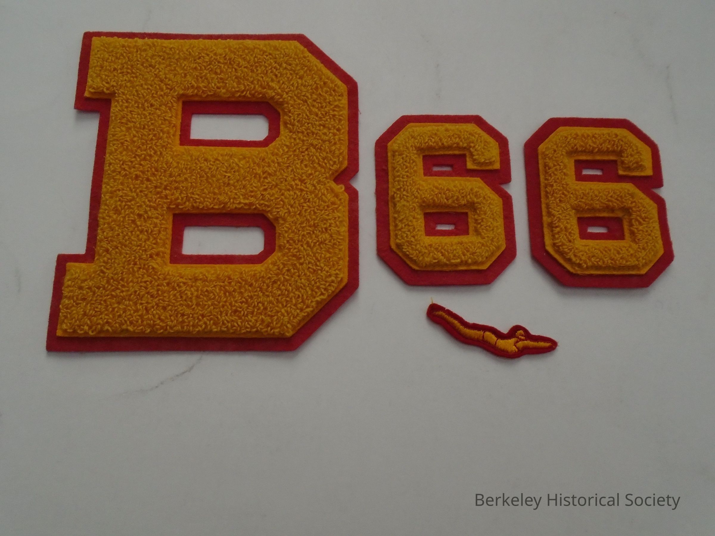 Gold and red felt Berkeley High School letters: B (19)66 swim team.