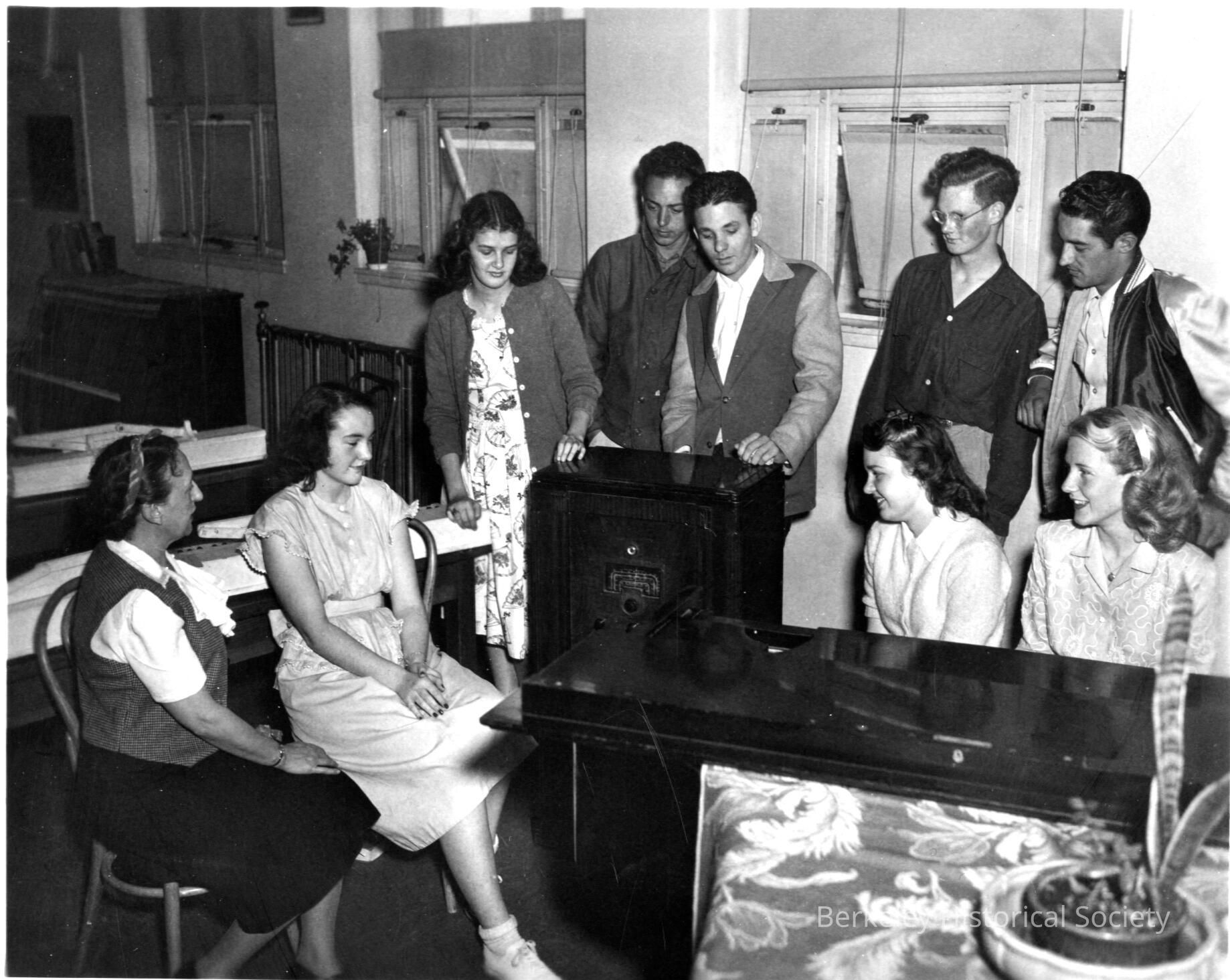 Class of eight students listening to radio with teacher Mrs. Doak.Other Names and Numbers