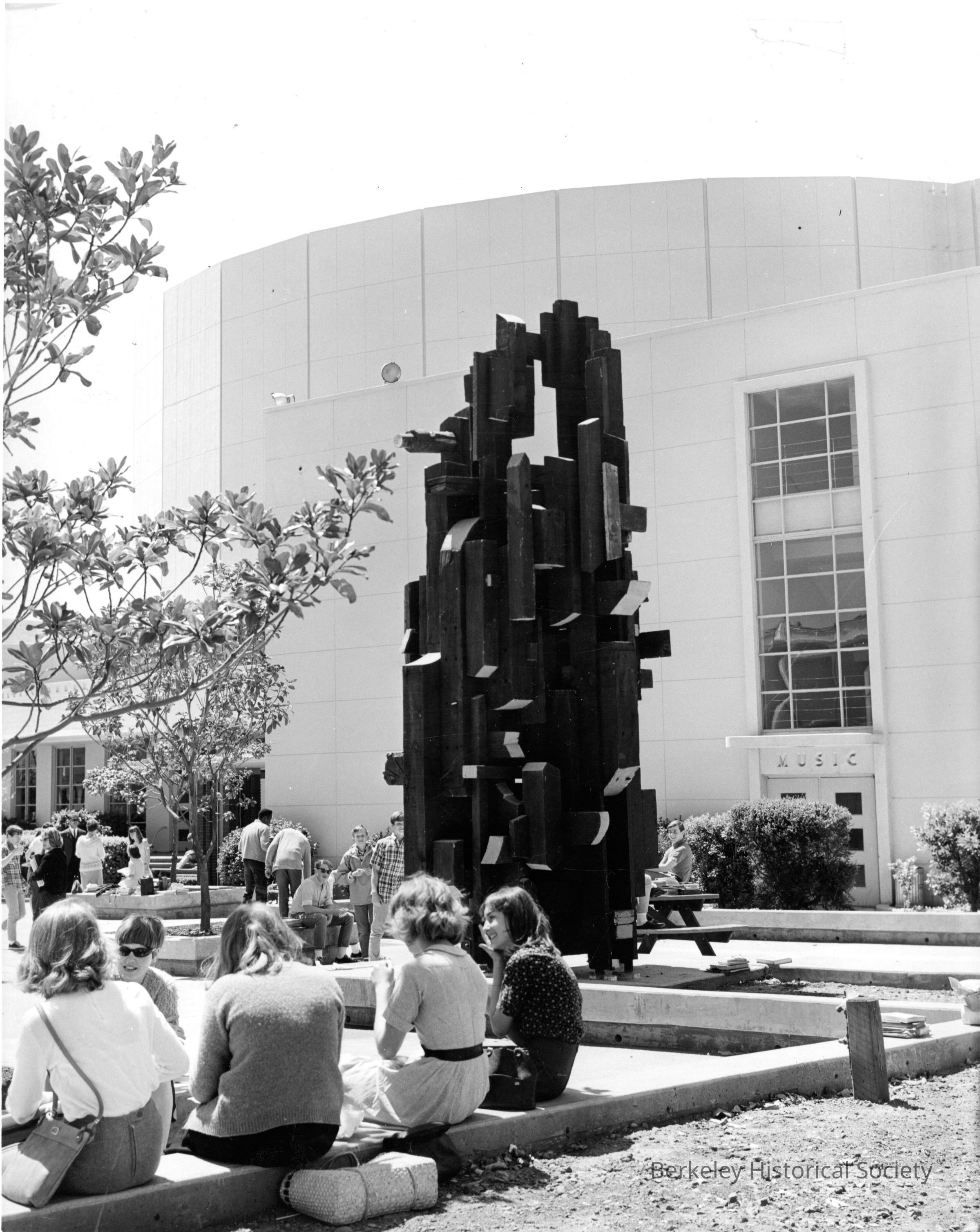 View across courtyard with sculpture; stndents; door into building with "music" over entrance.