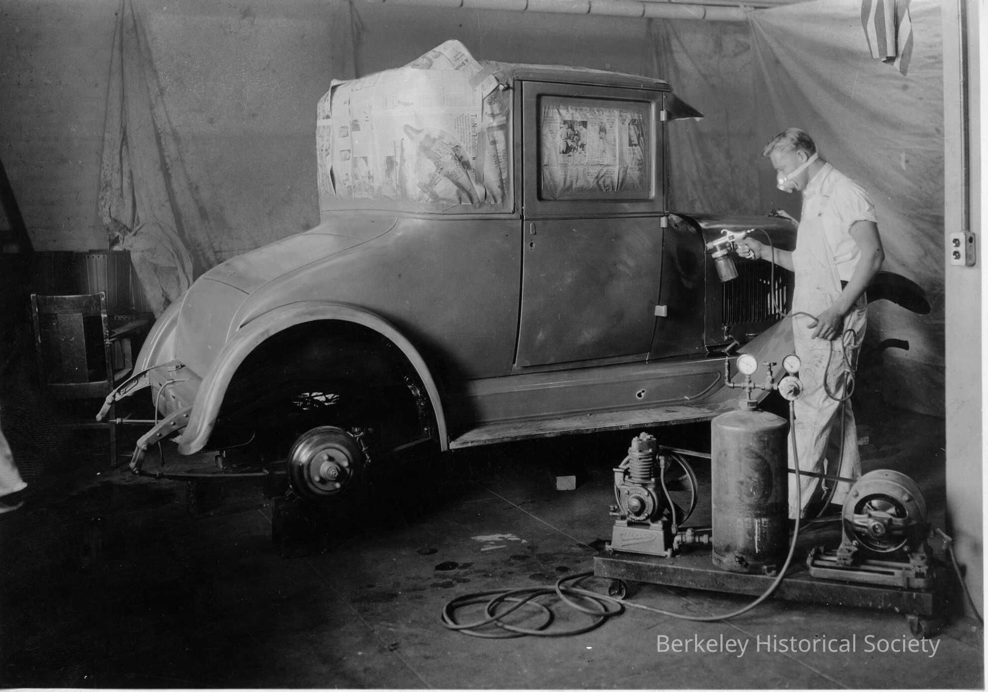 Berkeley High School vocational shop (auto); student painting car.