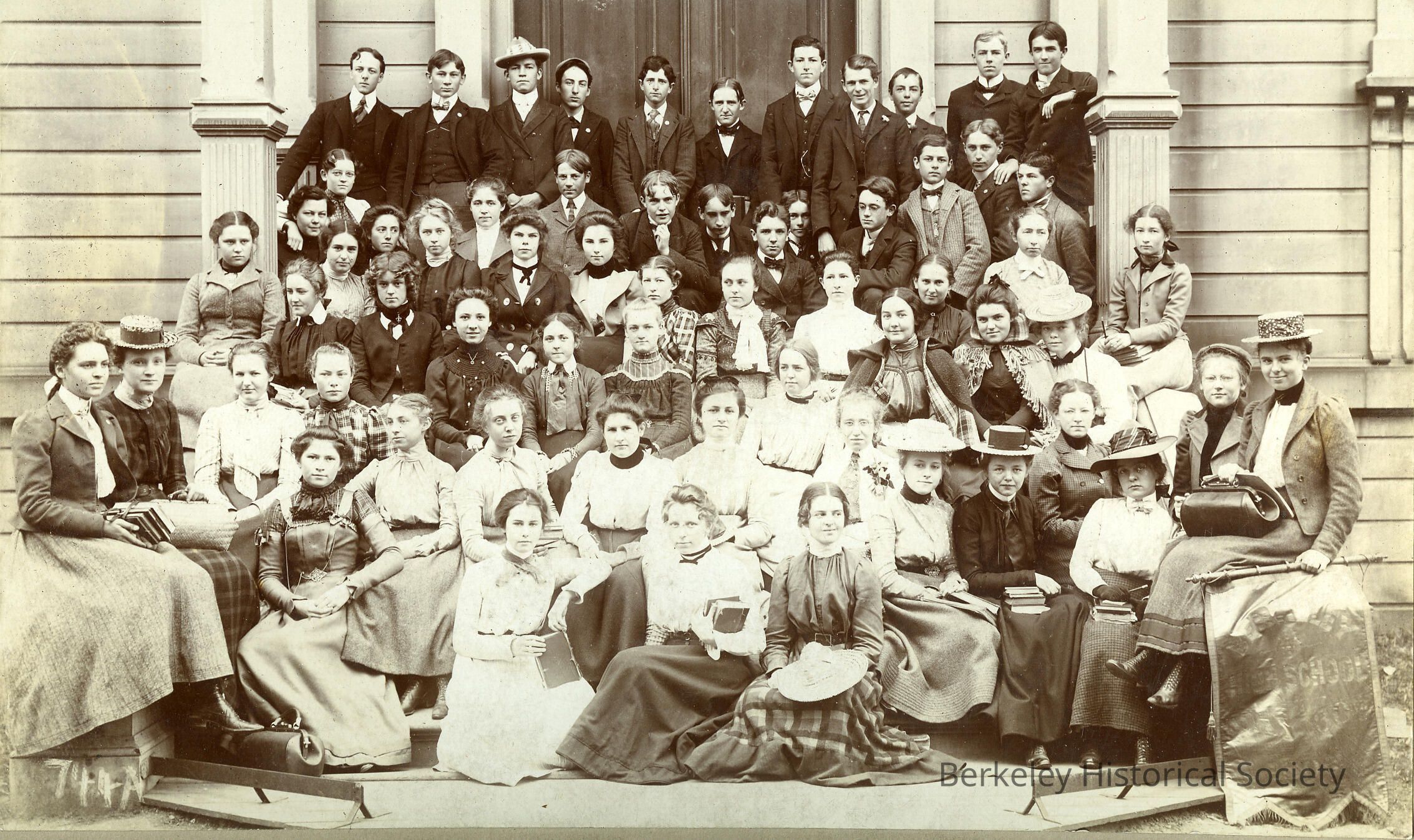 Berkeley high school class photo, students on front school stairs, front row students holding books, teacher on far right with the briefcaseMade/Created
