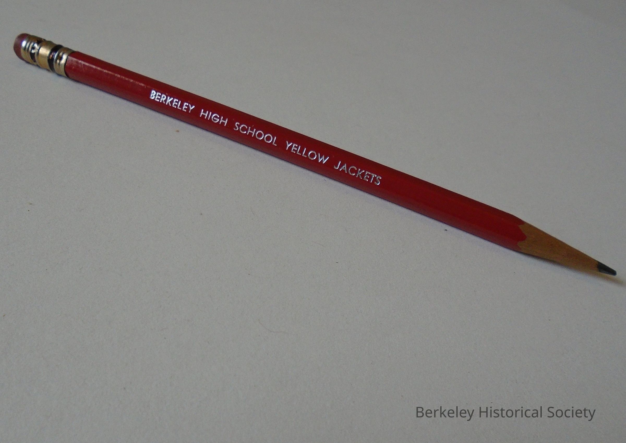 Red, wood, lead pencil with eraser, promoting "Berkeley High School Yellow Jackets". Sharpened.Lexicon