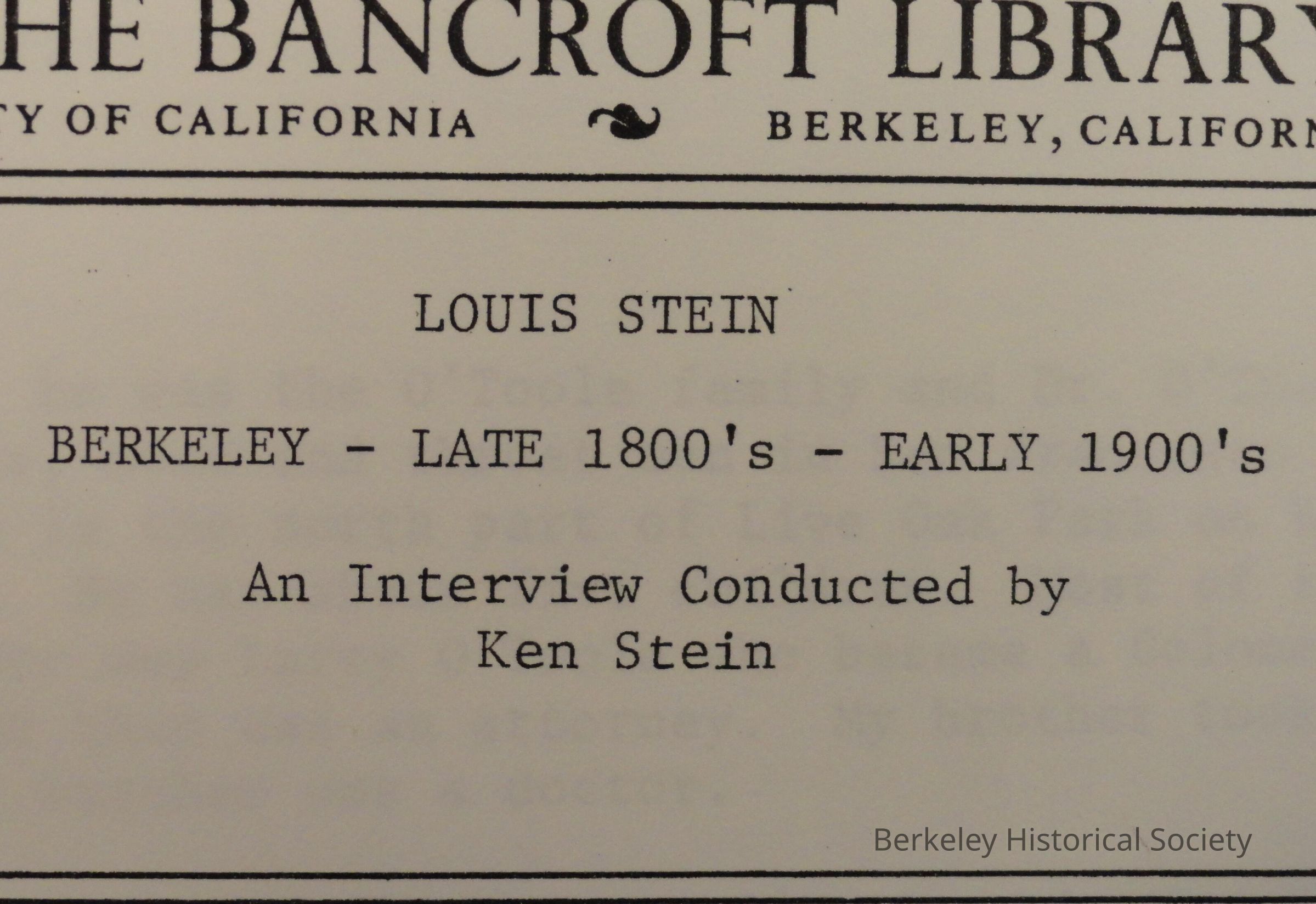 Families and businesses in North Berkeley, on Walnut and Vine Streets, including near Live Oak Park, on Shattuck Avenue; information about his father, Lorenz Louis Stein, and family; Louis Stein's own history as pharmacist.