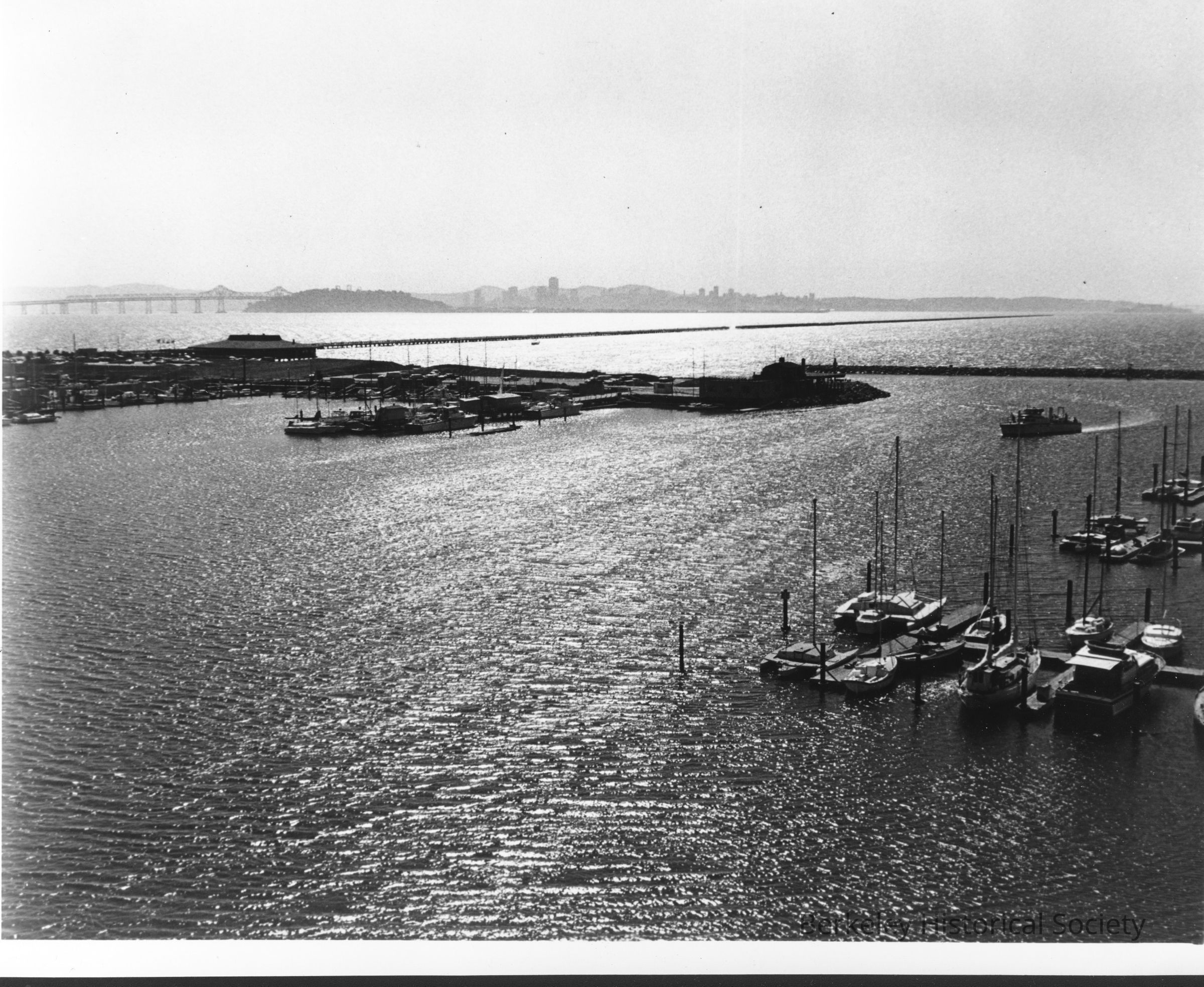 View across marina basin; some boats docked in lower right, others to some docks farther out; Bay Bridge and San Francisco in the distance.Other Names and Numbers
