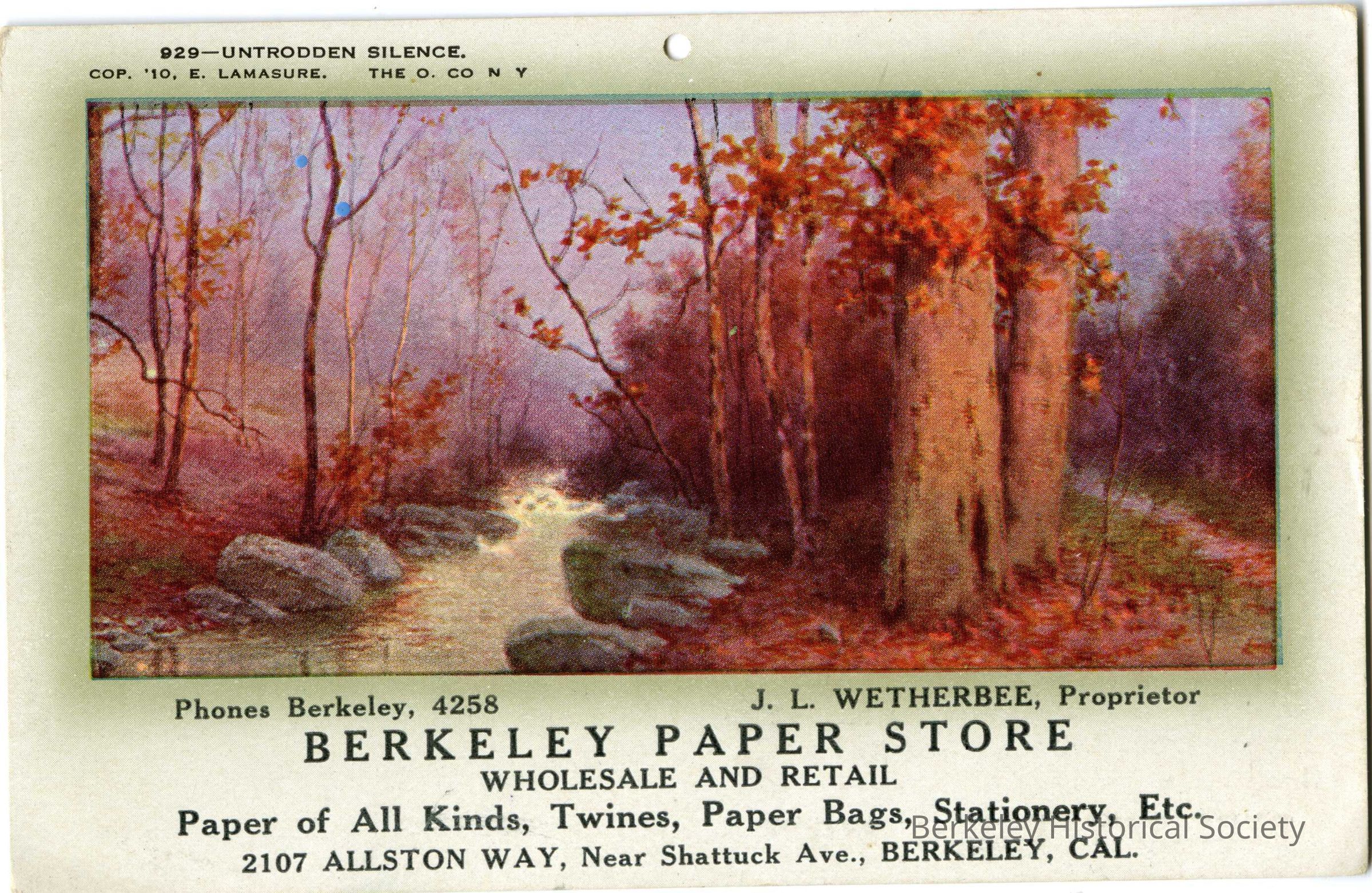 Two postcards advertising the Berkeley Paper Store owned by J. L. Wetherbee at 2107 Allston Way. One postcard features an image of trees and a creek in the fall and the other features an image of trees in spring.